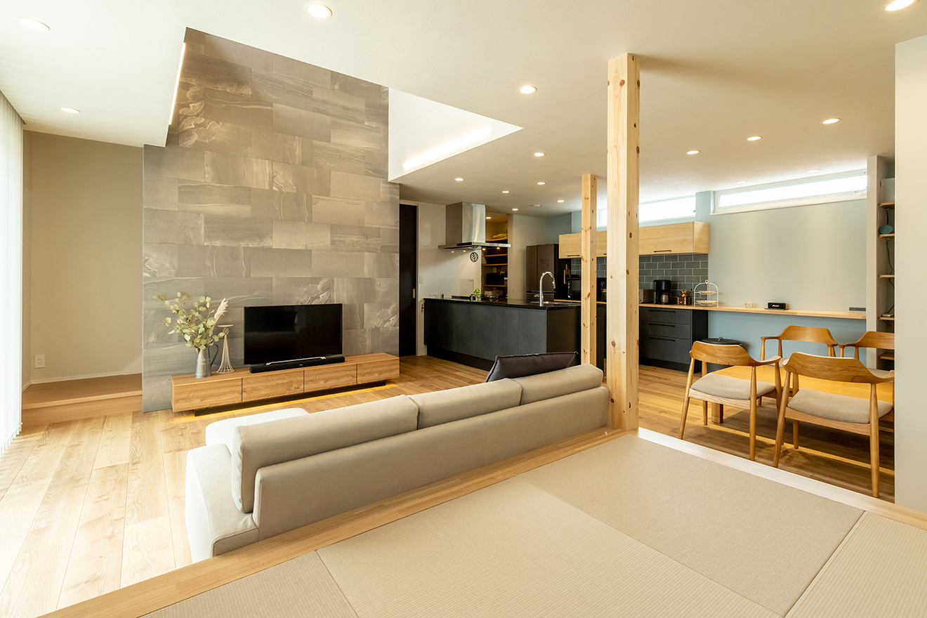 【LDK】キッチンで料理を作りながら、リビング、ダイニング、タタミコーナーを見渡せます。家族の会話も弾み、楽しさ溢れる空間に。床材には、落ち着いた色合いのチェスナットを採用。ナチュラルテイストで温かみのあるLDKに仕上がりました。
