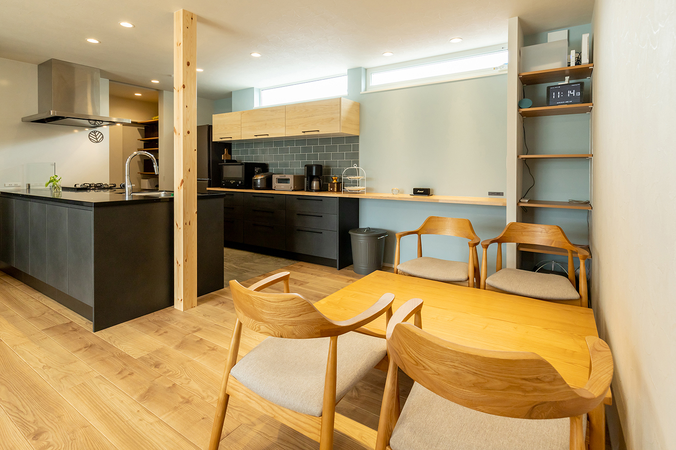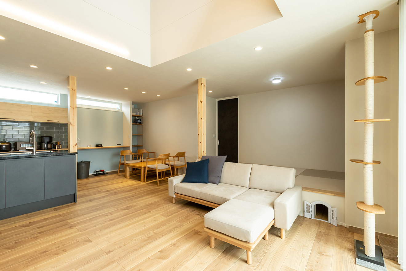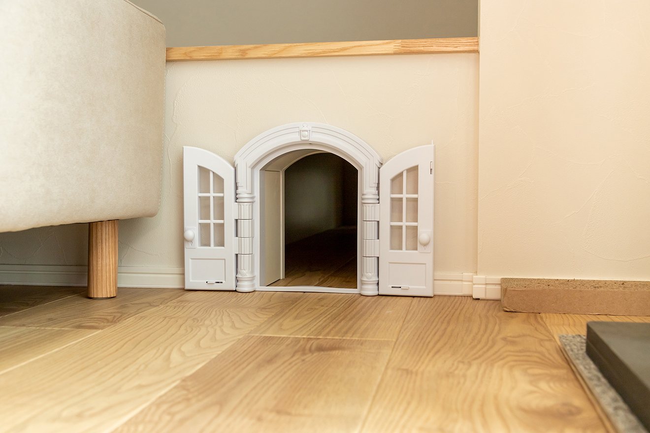 【猫扉】こだわりのペット用トンネル扉です。タタミコーナーの下を通って脱衣室へと繋がる猫ちゃん専用の快適通路。 【DK】ブラックのキッチンと木の風合いが印象的なキッチン。背面収納上部には、焼き物特有の風合いのグリーンタイルを貼りました。グリーン系のアクセントクロスとも相性抜群です。
