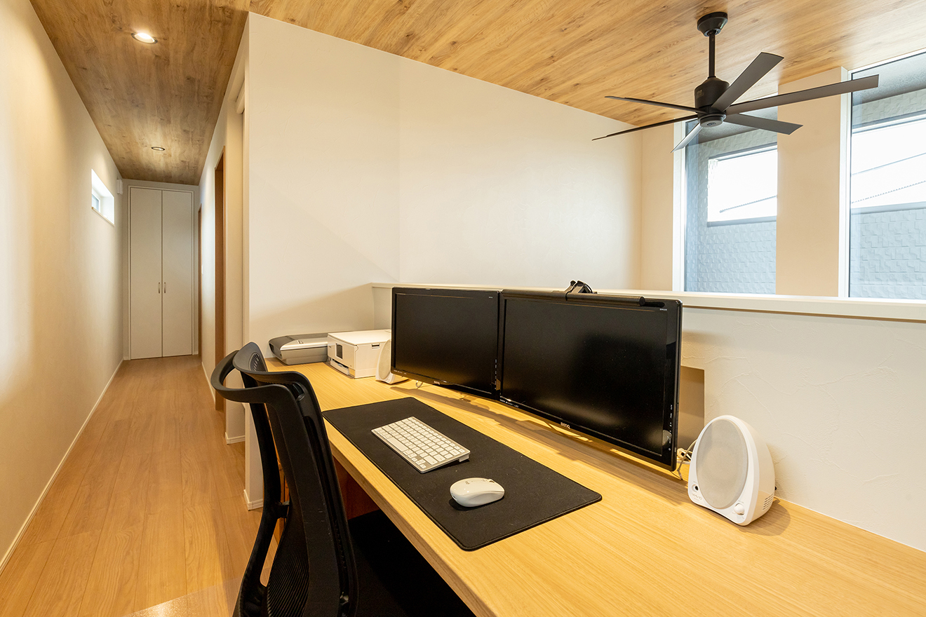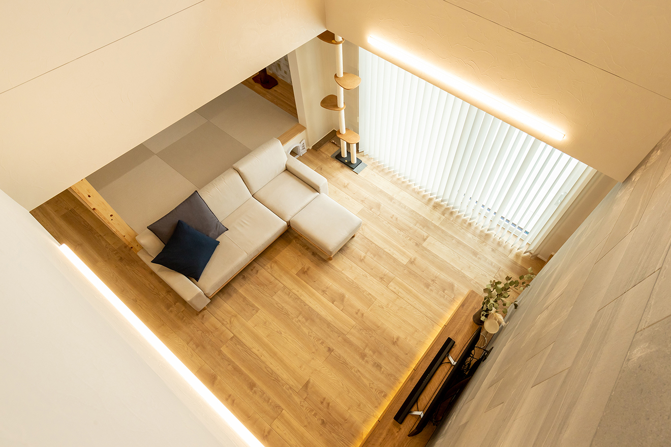 【吹き抜け】二階のスタディコーナーからの眺めは、リビングやタタミコーナーを見渡せて繋がりを感じられます。 【スタディコーナー】二階ホールにパソコンコーナーを設けました。開放的な明るい空間で集中力もアップ。