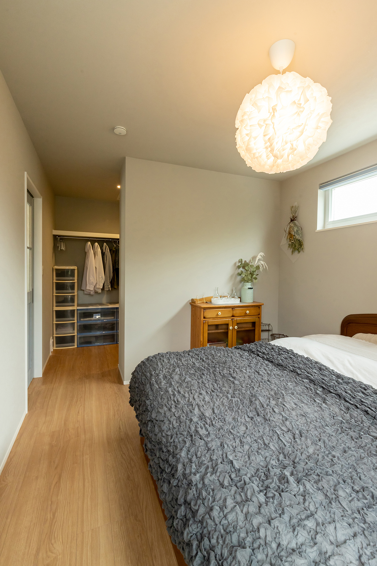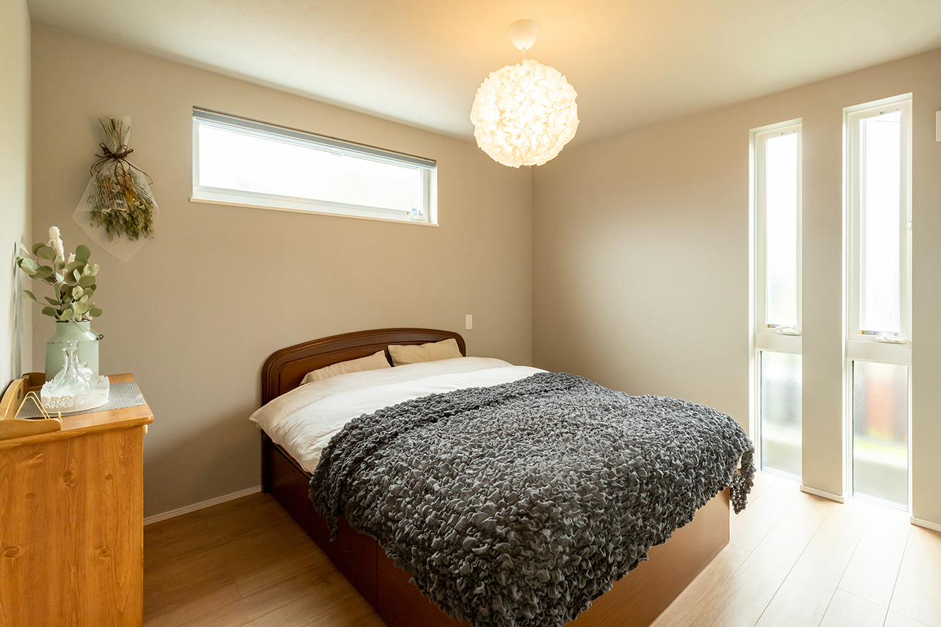 【主寝室】寝室に防犯上も安心感のあるスリット窓を選択。風通しも良好な窓配置です。壁は、グレークロスで落ち着いた印象に。ウォークインクローゼットで十分な収納も確保。