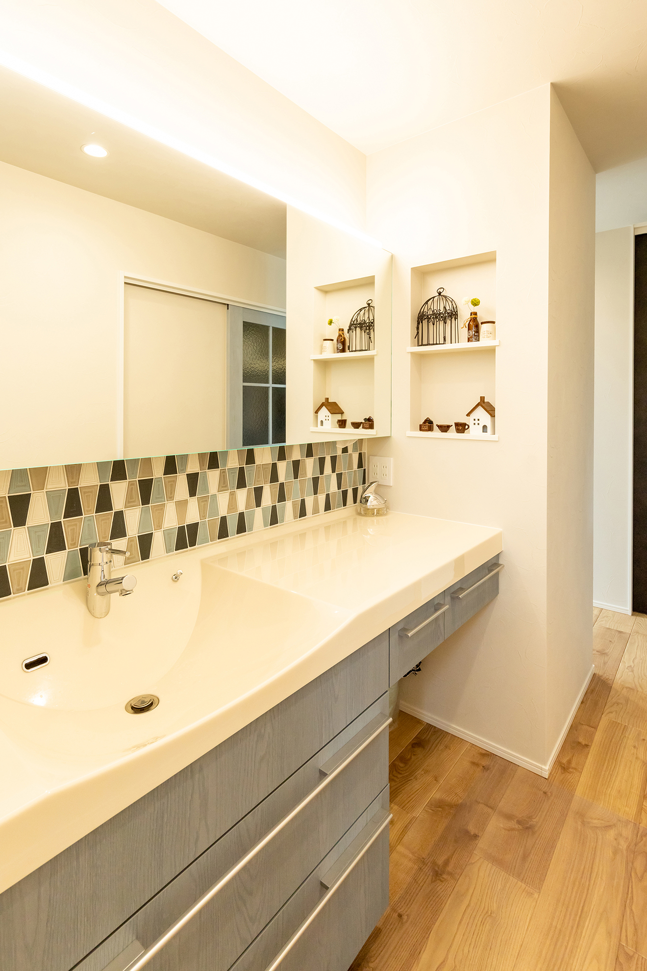 【洗面】幅広の洗面台は2人で並べる広々設計。毎日の身支度が楽しめるデザイン性と、間接照明で明るい印象になりました。 【トイレ】タンクレストイレと黄色を基調にしたクロスでシンプルにまとめました。