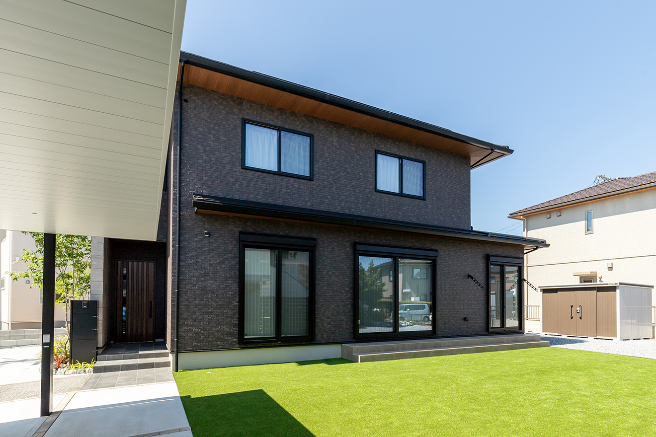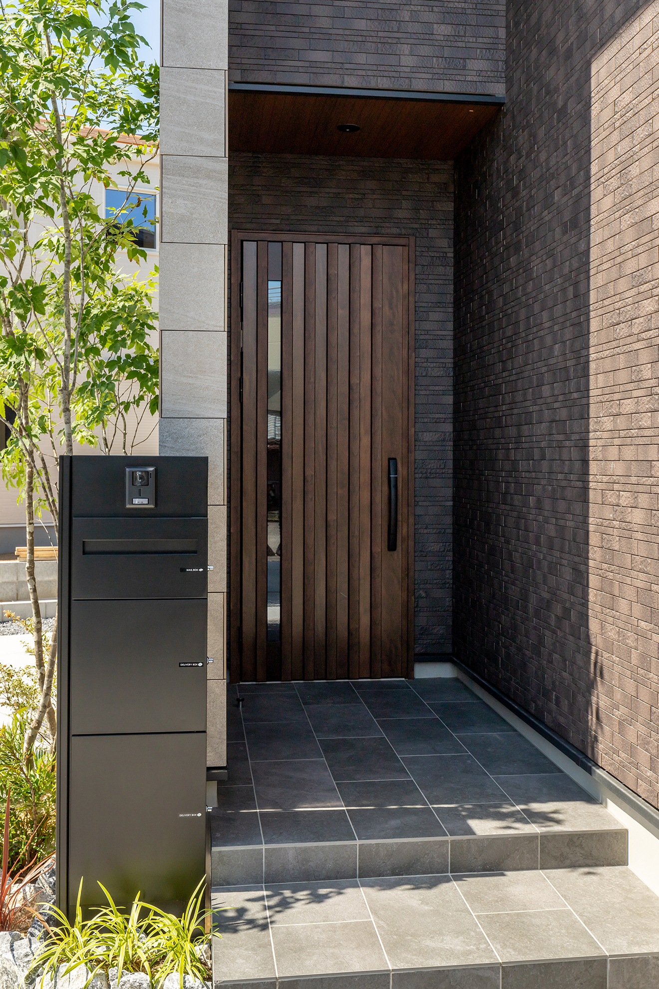 【庭】LDKに光が降り注ぐように南に広い庭を設けました。BBQや日向ぼっこを楽しめます。【アプローチ】玄関は隠す設計に。アクセントのタイルが引き立ちます。スムーズなアプローチとなるよう、高さを設定しました。高級感のある床タイルが目を惹きます。