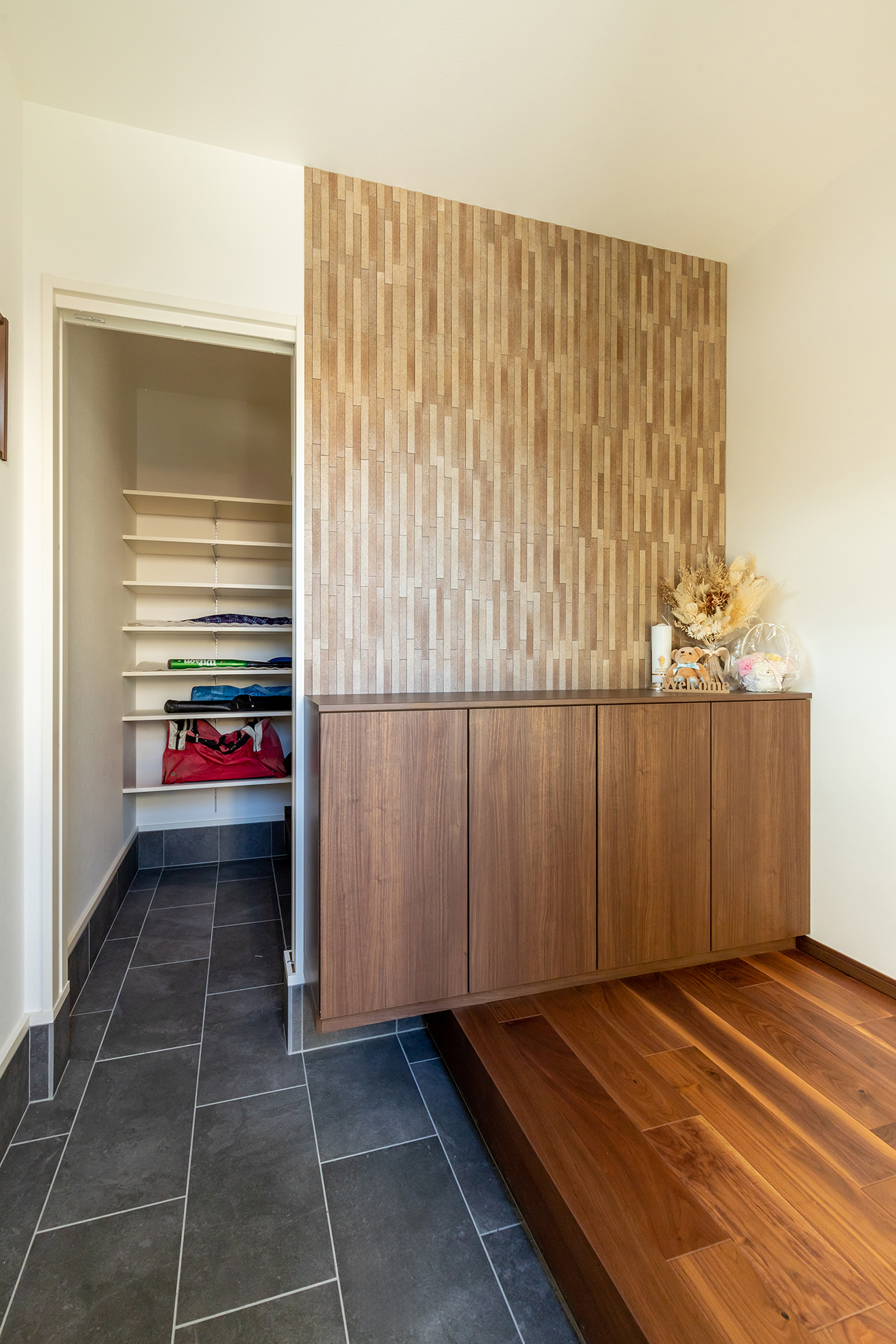 【玄関】室内に入って最初に目に入るエコカラット。奥には回遊性のあるシューズクロークを設け、キッチンまでのアクセスを快適に。 【キッチン】キッチンは高級感のあるグラフテクトを採用。重厚な存在ながら空間にやさしく溶け込みます。