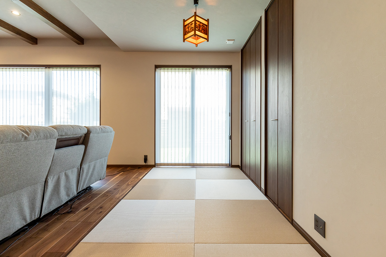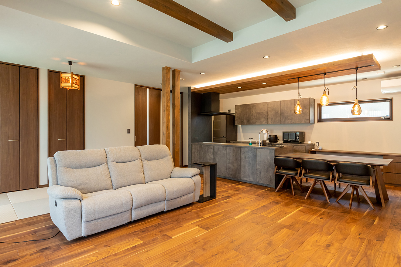 【リビング】化粧梁が見える高天井で空間の広がりを持たせました。床材と同系色の梁は高級感と統一感を兼ね備えています。 【タタミコーナー】和のエッセンスを加えつつ、遊び心を持たせています。
