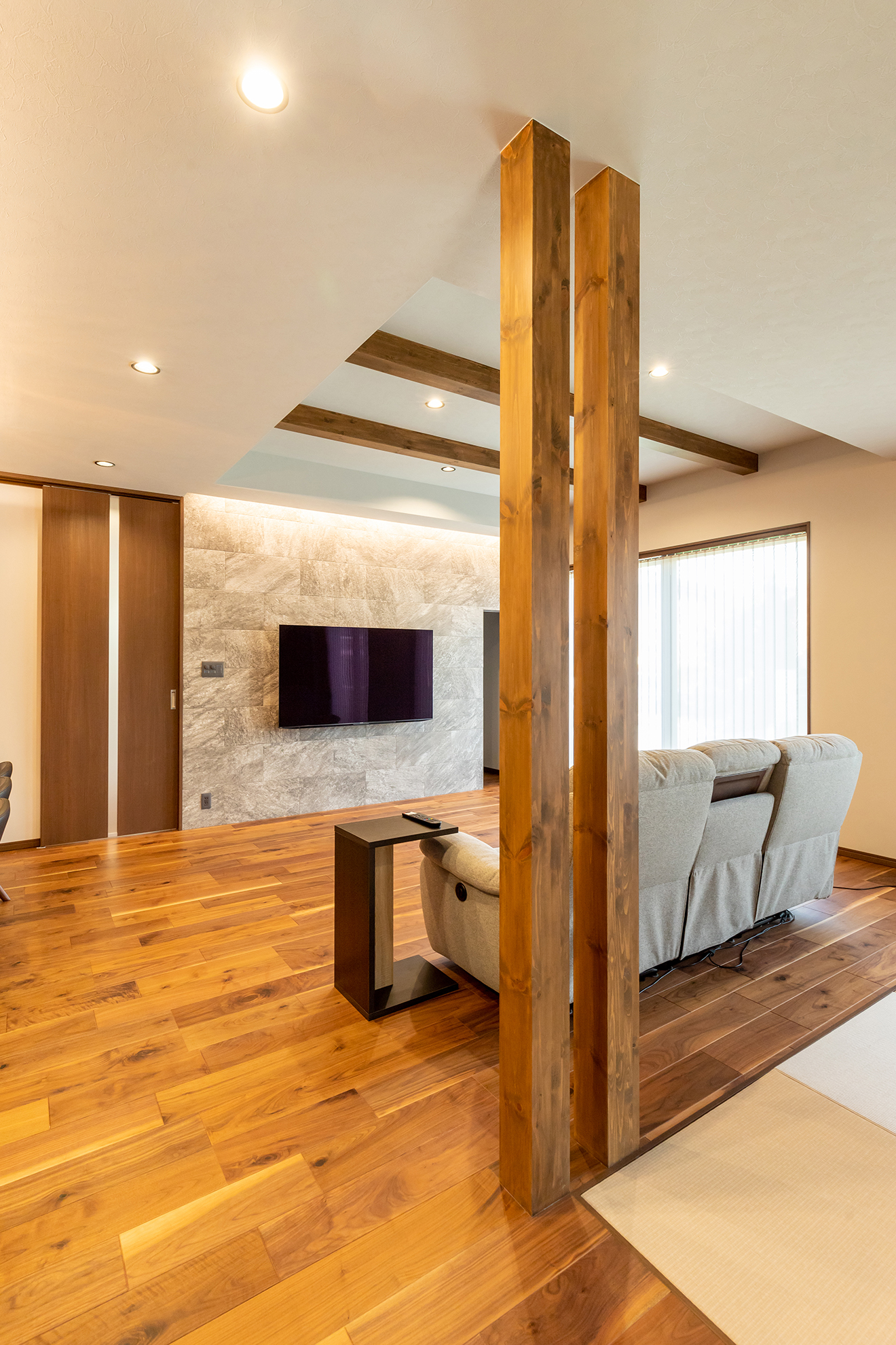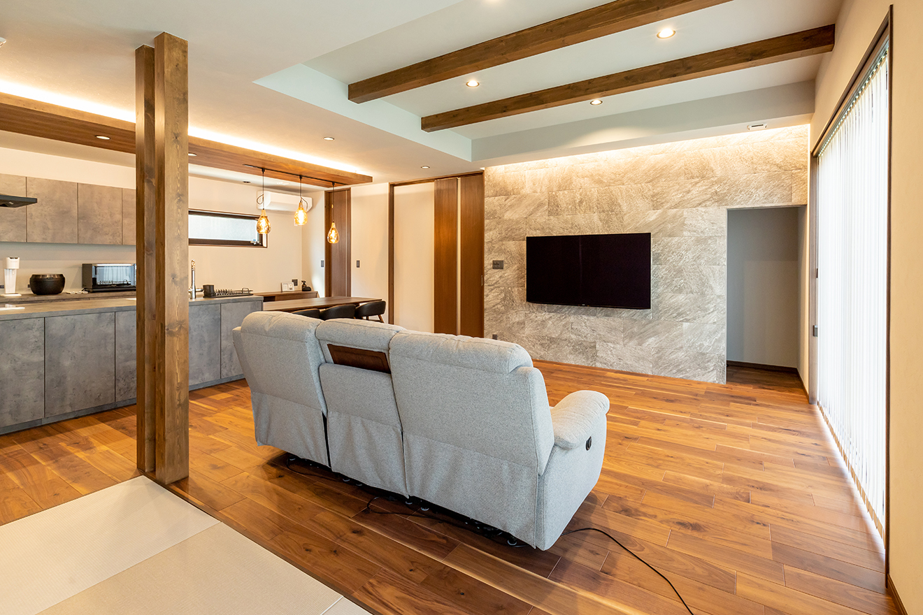 【リビング】TVは壁付けとし、壁にタイルを貼りました。グレーのシックなデザインが高級感を演出。奥には階段下を活用したリビング裏収納を設けています。 タタミコーナーとリビングの間には2本の化粧柱を配置。狭くならないよう配慮し、カラーを統一しました。