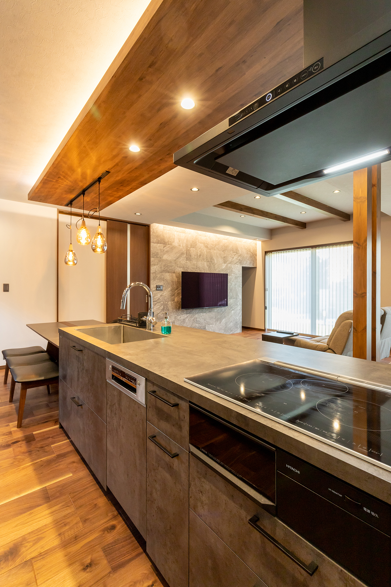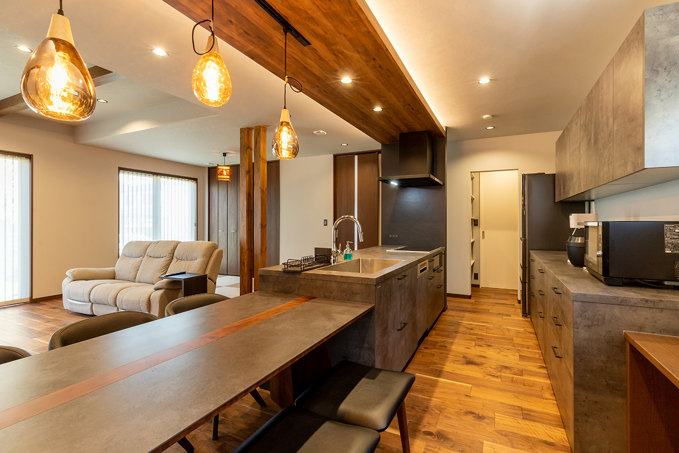 【ダイニング】キッチン上部に下げ天井を設けて空間を仕切ります。木目との隙間には間接照明が灯り、意匠性がアップ。 【LDK】キッチンからLDK全体を見渡せる設計は子育てにも向いています。南面の大きな窓から光が注ぎ明るい空間に。