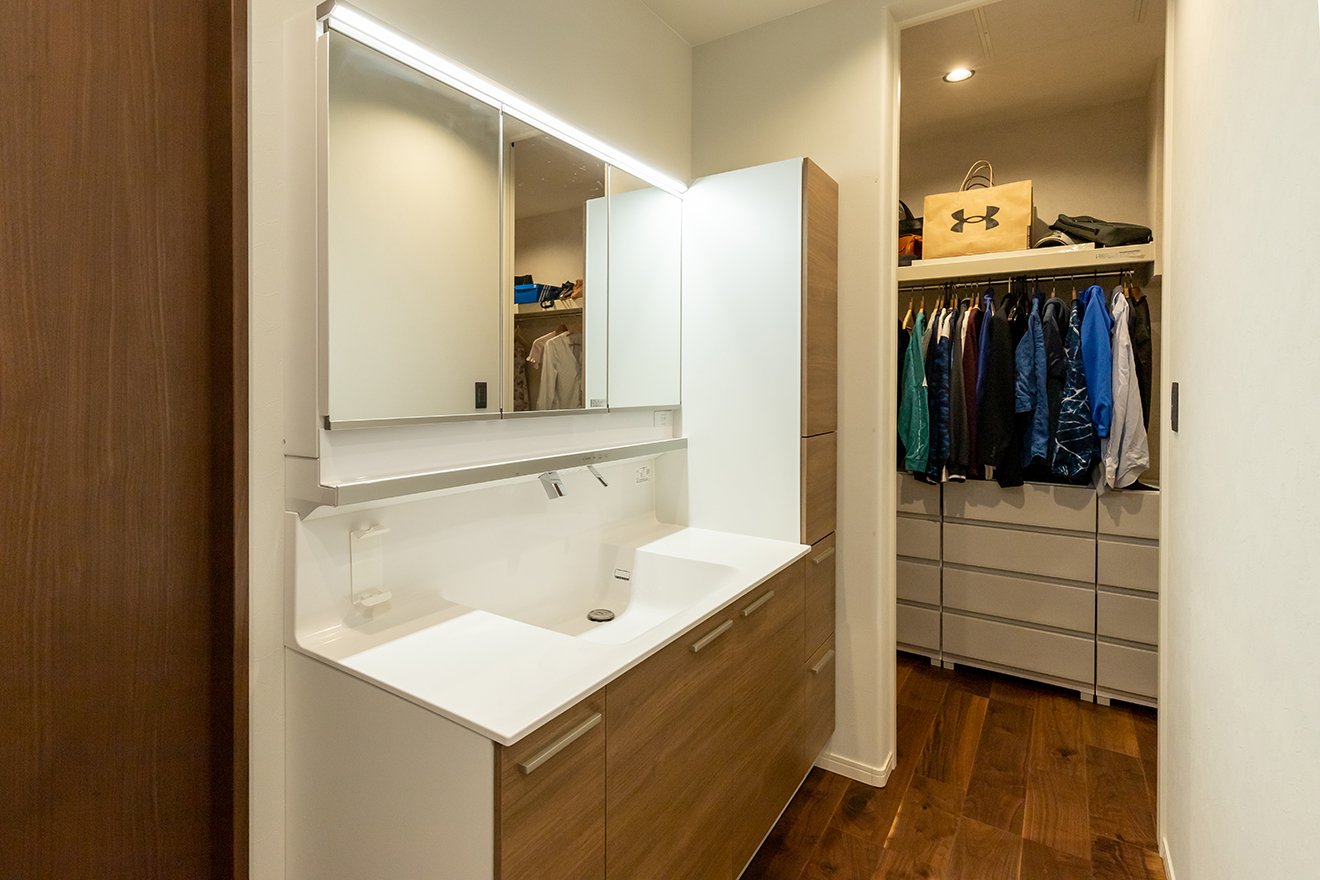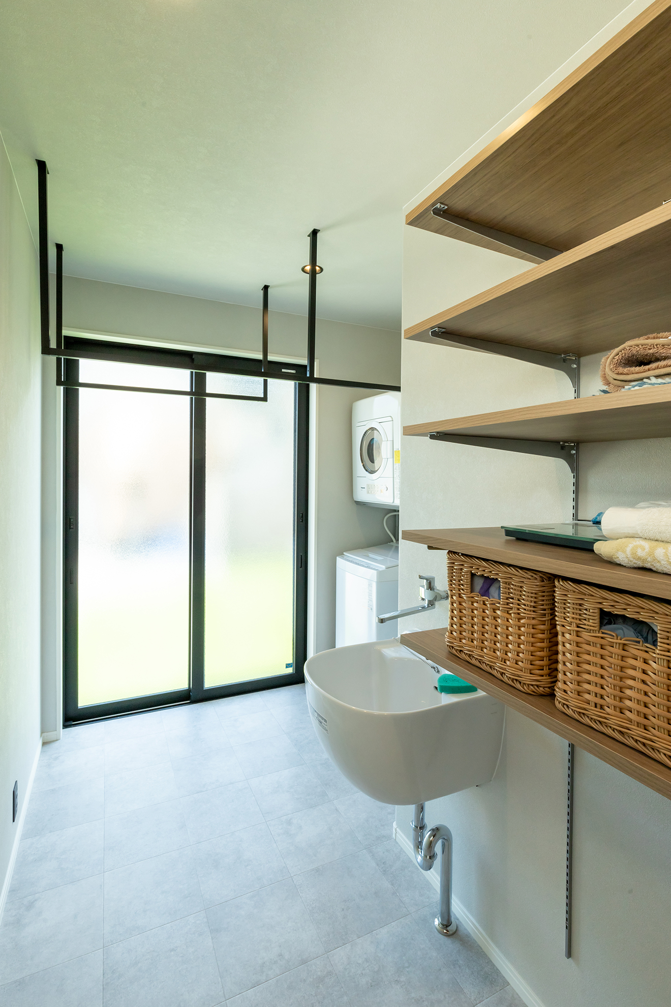 【洗面】洗面室からファミリークロークまで回遊動線を確保。朝の身支度がスムーズに完結できます。 【ランドリールーム】南面に設けることで家事がより快適に。スロップシンクを設け、ちょっとした洗濯が簡単に済ませられます。