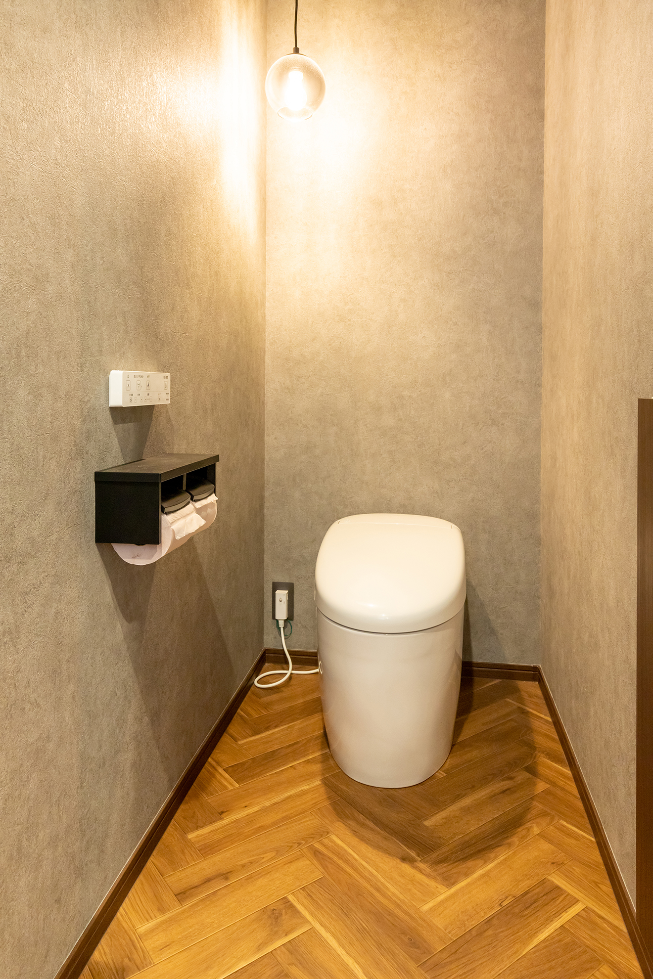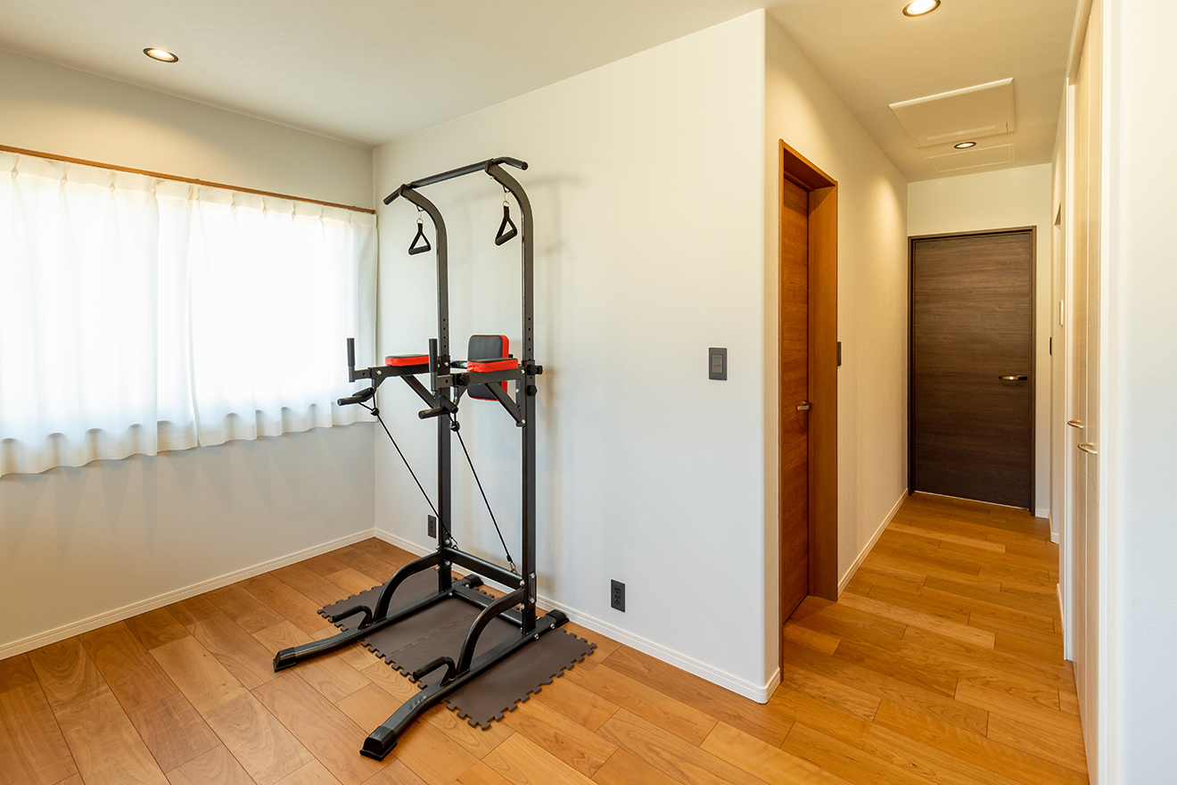 【トイレ】模様のある灯り方がお洒落なペンダント照明。内装は落ち着いたグレートーンで統一しました。 【フリールーム】二階のフリールームはトレーニングスペースに。他用途な使い方ができる空間があると便利です。