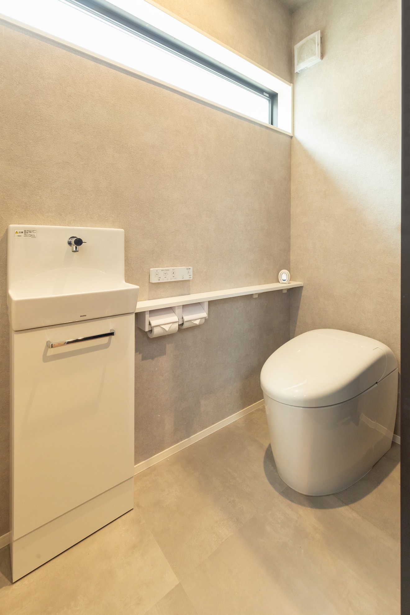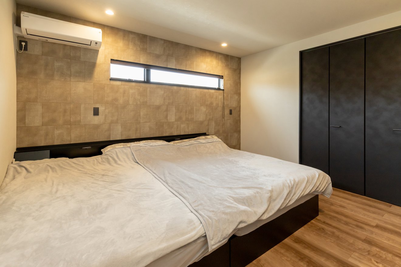 【トイレ】落ち着いた色合いのトイレに横長サッシを設け、明るさと視線対策を両立。 【寝室】アクセントクロスと黒のクローゼット扉で上質な雰囲気に。横長の窓から朝日が差し込みます。