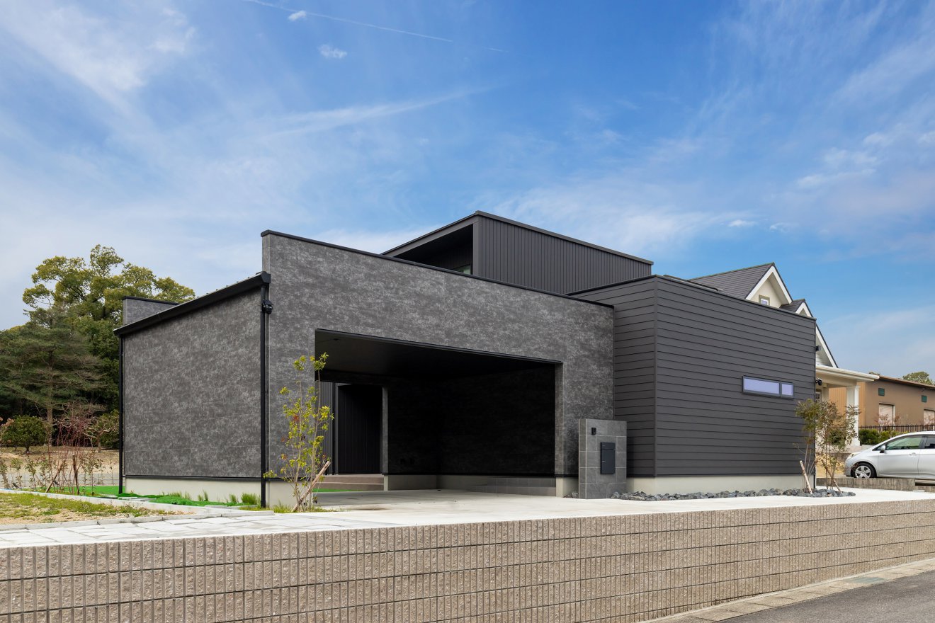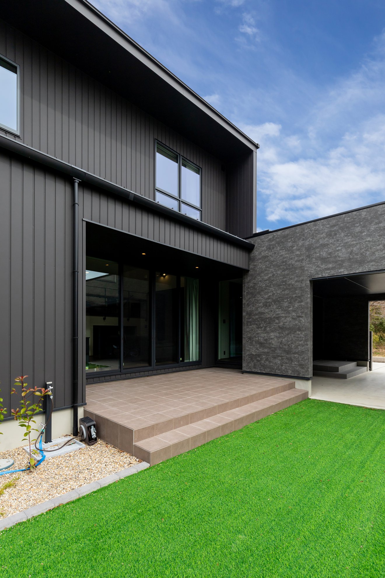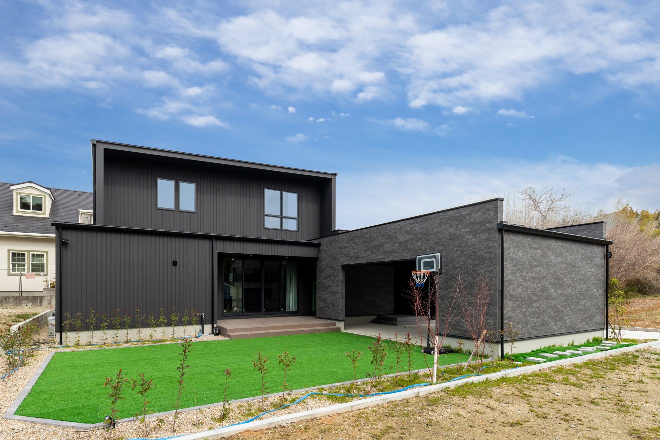 【外観】広い敷地を活かし、建物やガレージで外からの視線を遮ることで、周囲を気にせず過ごせるプライベートな庭を設けました。ガレージの奥に広がるのは、癒しのテラスタイルスペース。