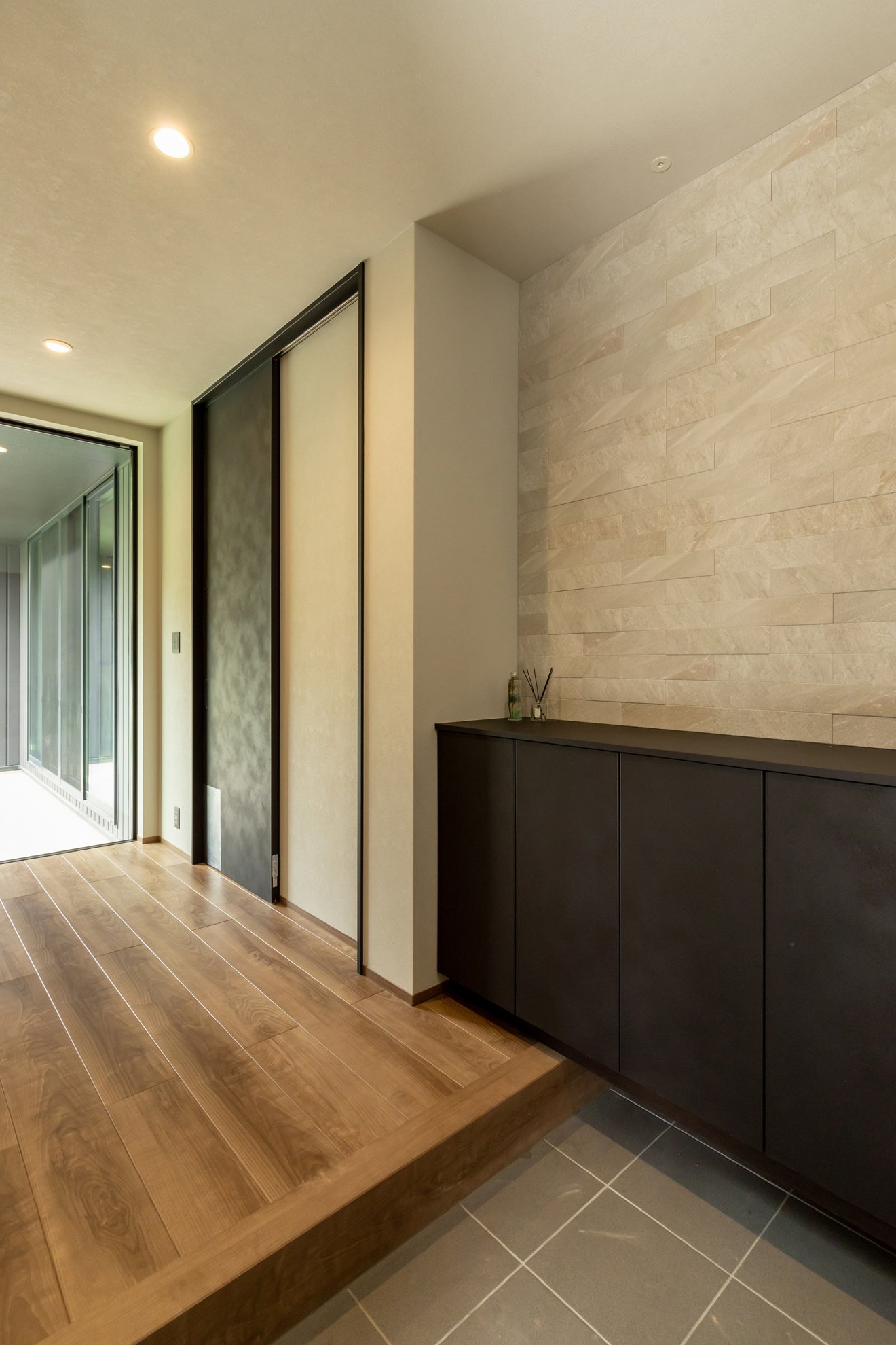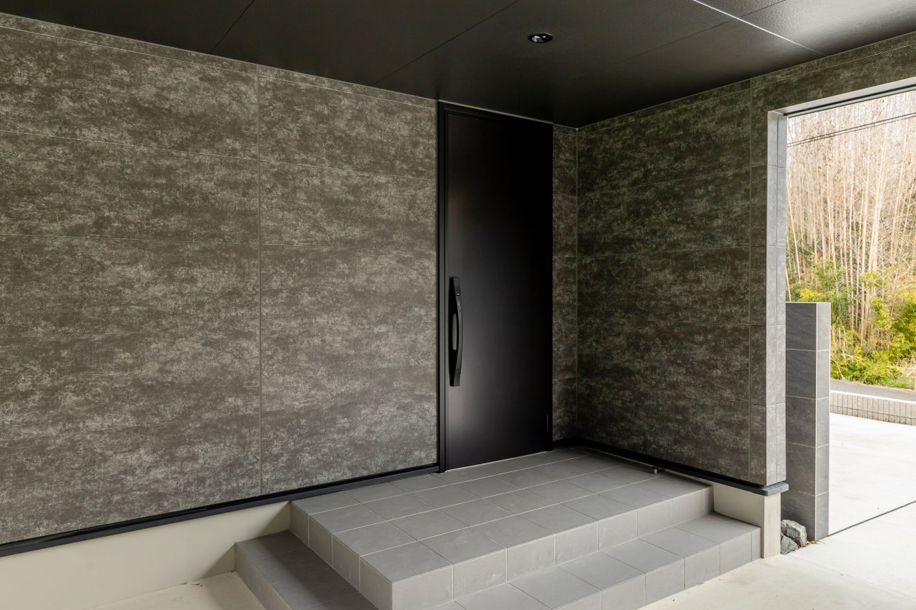 【玄関】道路からの視線を遮る位置に玄関ドアを配置し、上端は軒天のラインにぴったりと合わせました。ガレージから直接出入りできる動線で、天候に左右されず快適に過ごせます。玄関正面には石目調のエコカラットが高級感を演出。リビングへ続く動線には大きなFIX窓を設け、中庭の景色を楽しみながら移動できます。