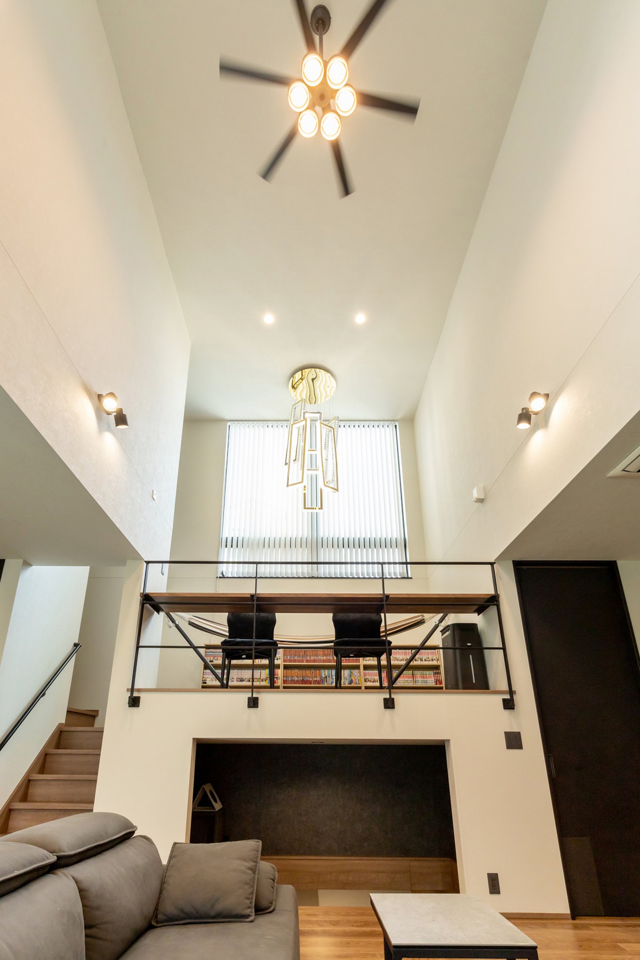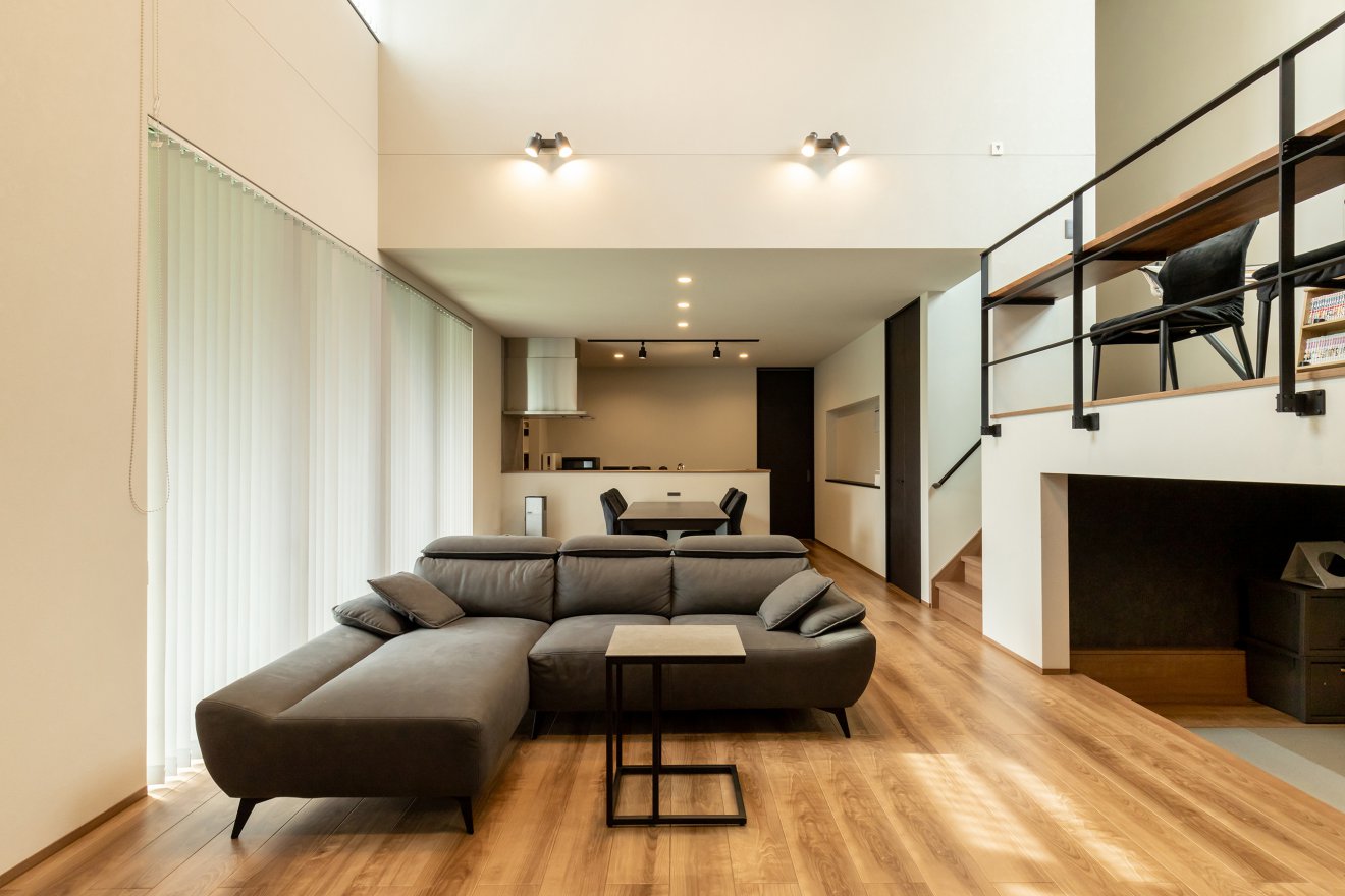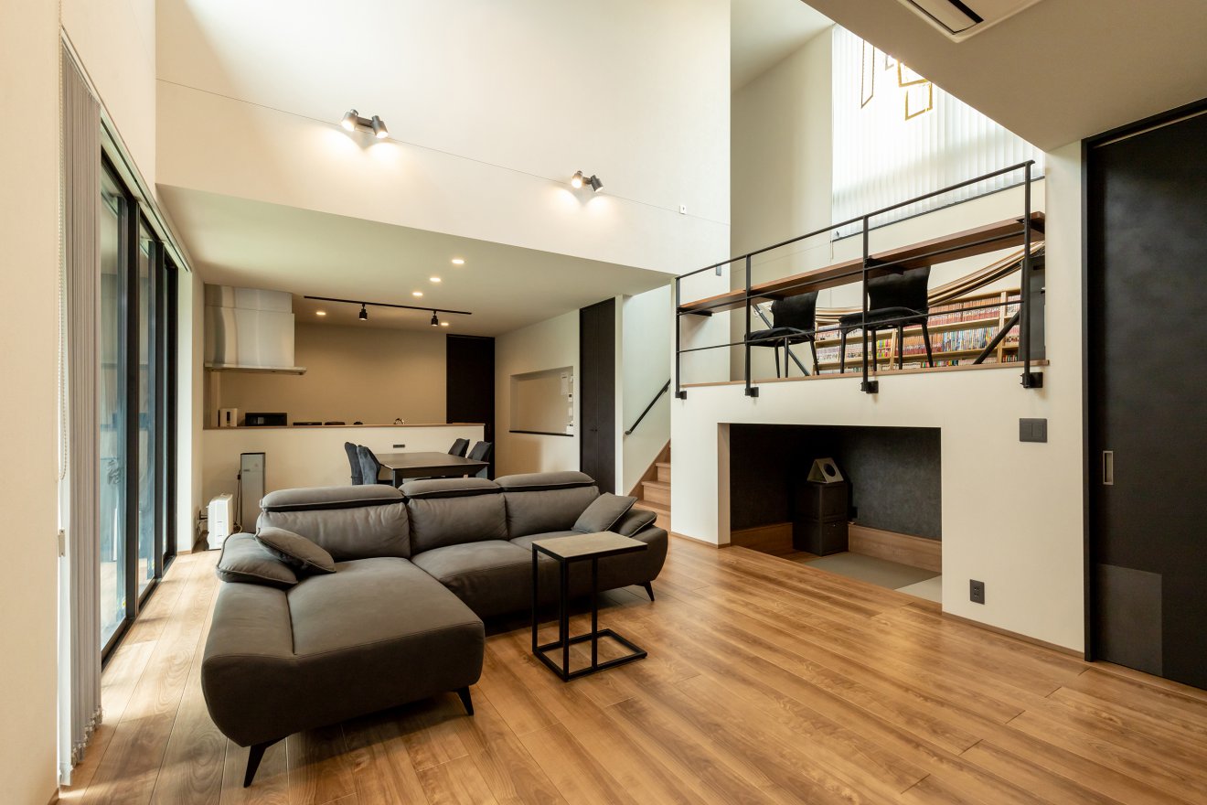 【LDK】リビングドアを開けるとまず目に飛び込んでくるのは、ダイナミックな吹き抜け空間。開放感に包まれながら奥には広がりを感じさせる書斎スペースが配置され、住まい全体に豊かな表情を与えています。