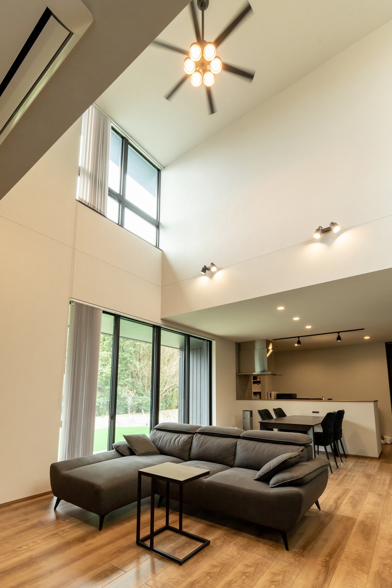 【LDK】天井や吹き抜けの開口部の縦横のラインも美しく揃え、全体に統一感と洗練された印象を与えています。南側には、大きな窓を組み合わせて配置し、室内にたっぷりと自然光が降り注ぐ明るく開放的な空間を実現。