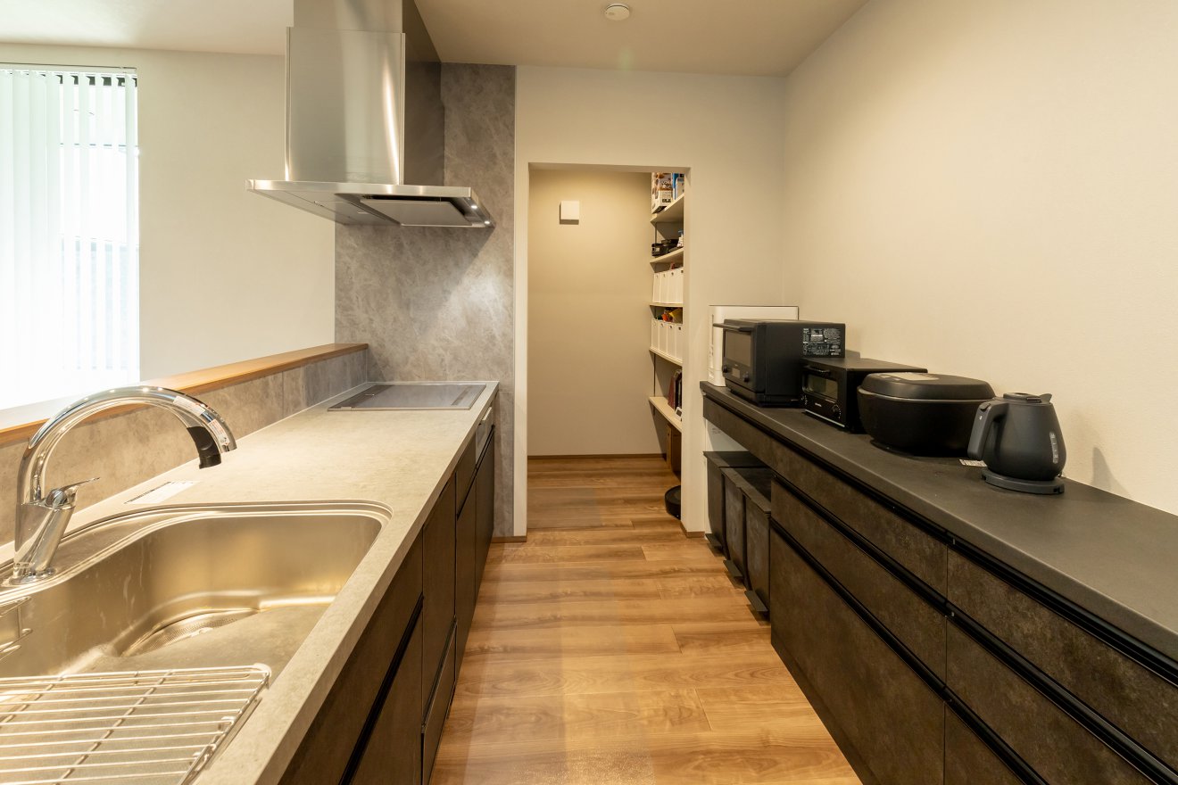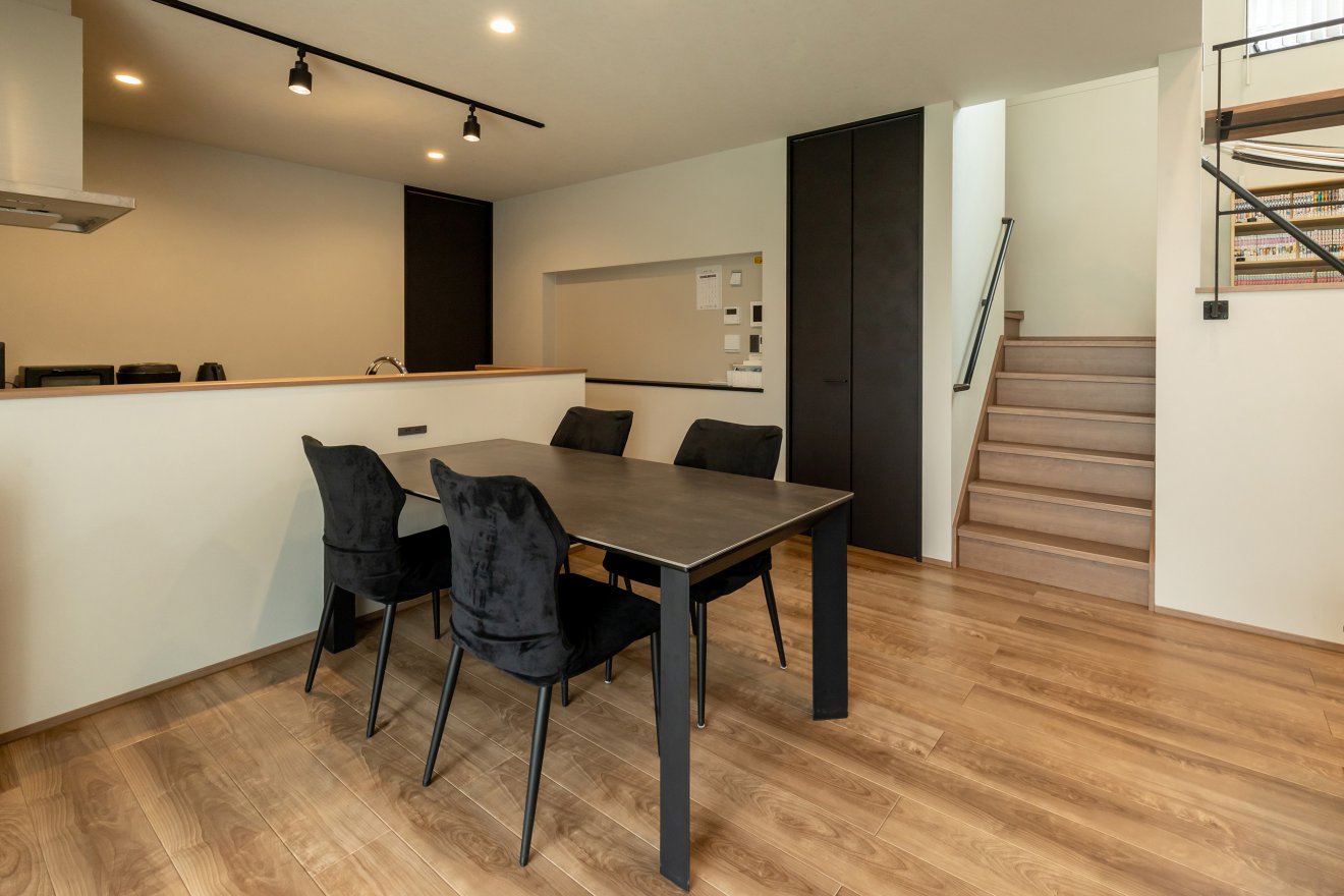 【ダイニング】壁面のニッチに大きなマグネットボードを設置。予定を書いたり写真を飾ったり、日常を楽しく彩ります。 【キッチン】キッチンはブラック系で統一し、引き締めたデザインに。石目柄パネルが上質さを加え、機能美も兼ね備えています。