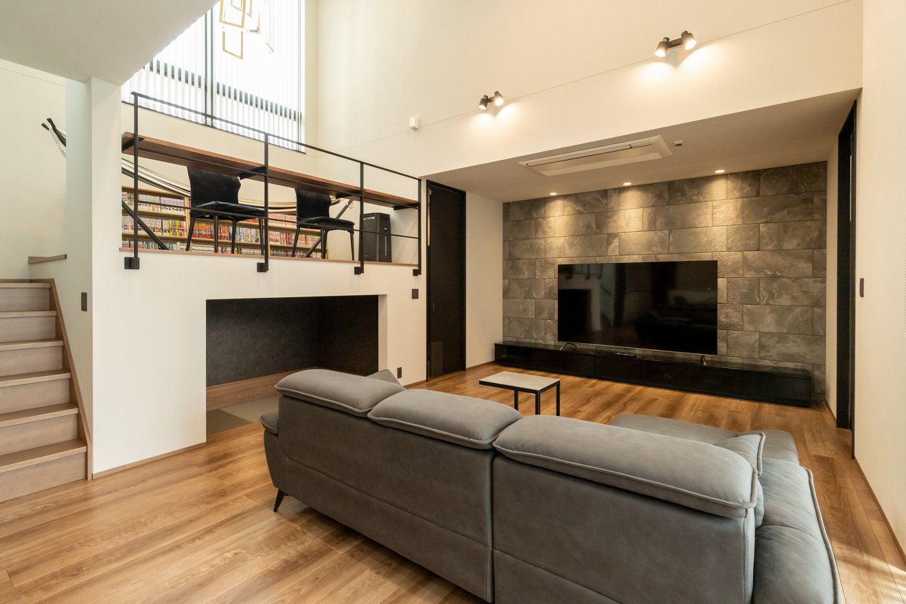 【リビング】TV背面には、空間のアクセントとなる上質な石柄デザインのタイルを貼り、高級感を演出。さらにヌックや書斎、吹き抜けまで見渡せる開放的な設計。北側のハイサッシから降り注ぐ光は視線を自然に誘導し、縦方向へと伸びやかな空間を印象付けます。