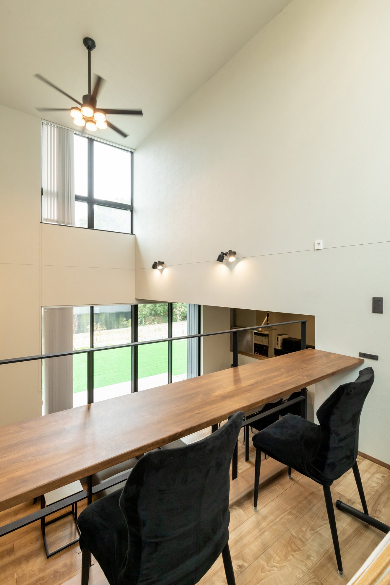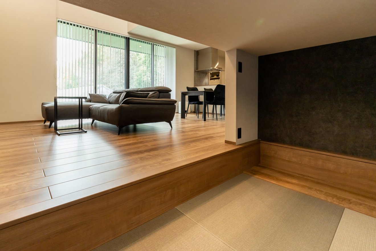 【ヌック】心安らぐヌックスペースは、ダウンフロアでリビングと程よくつながりつつ、落ち着ける個室感を演出。畳敷きの床でごろ寝もできる極上のスペースです。 【書斎】吹き抜けに位置するスキップフロアは、LDKを見渡せる開放的な空間です。大きなサッシ越しの庭の緑が、視界を広げ心地よさを演出。