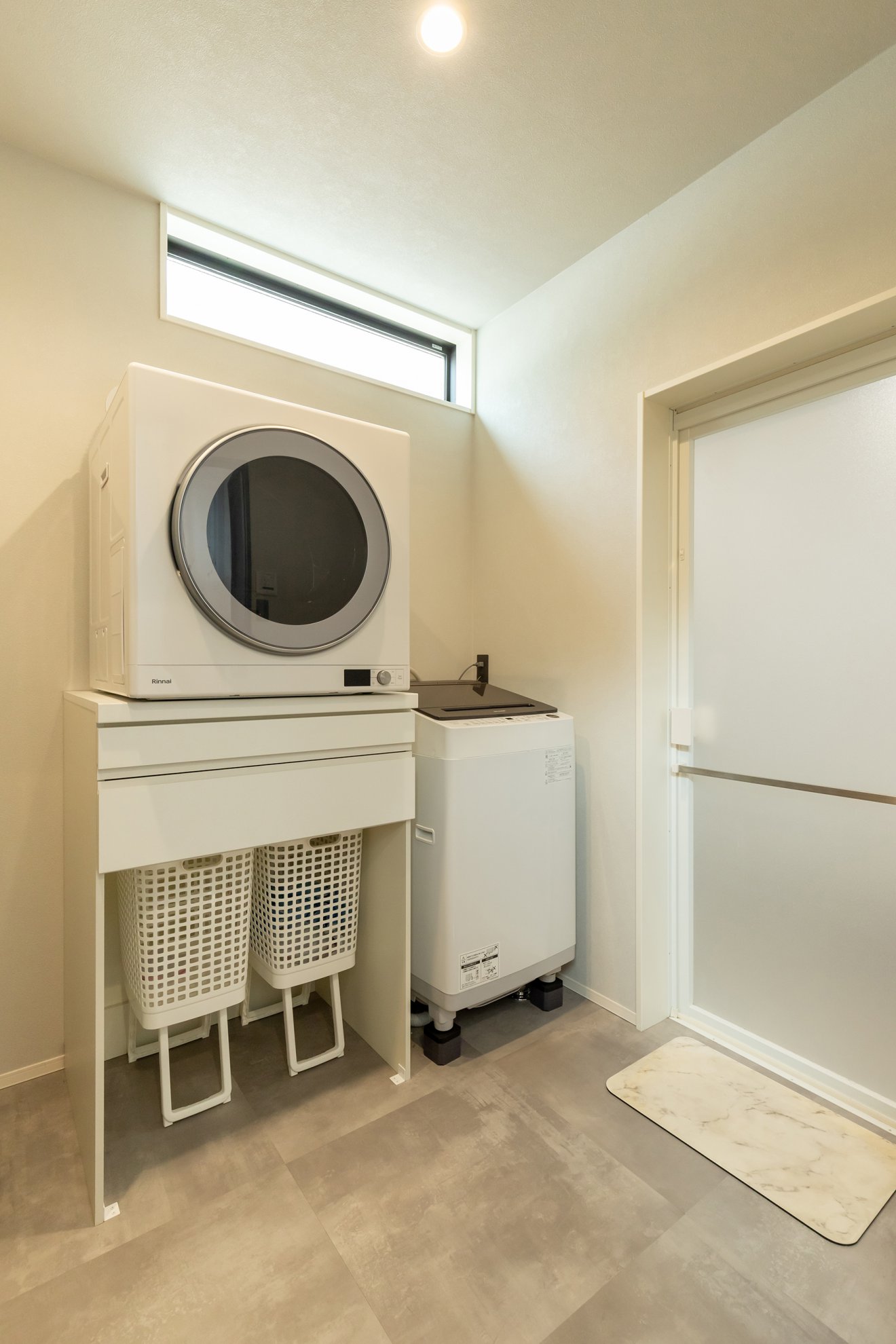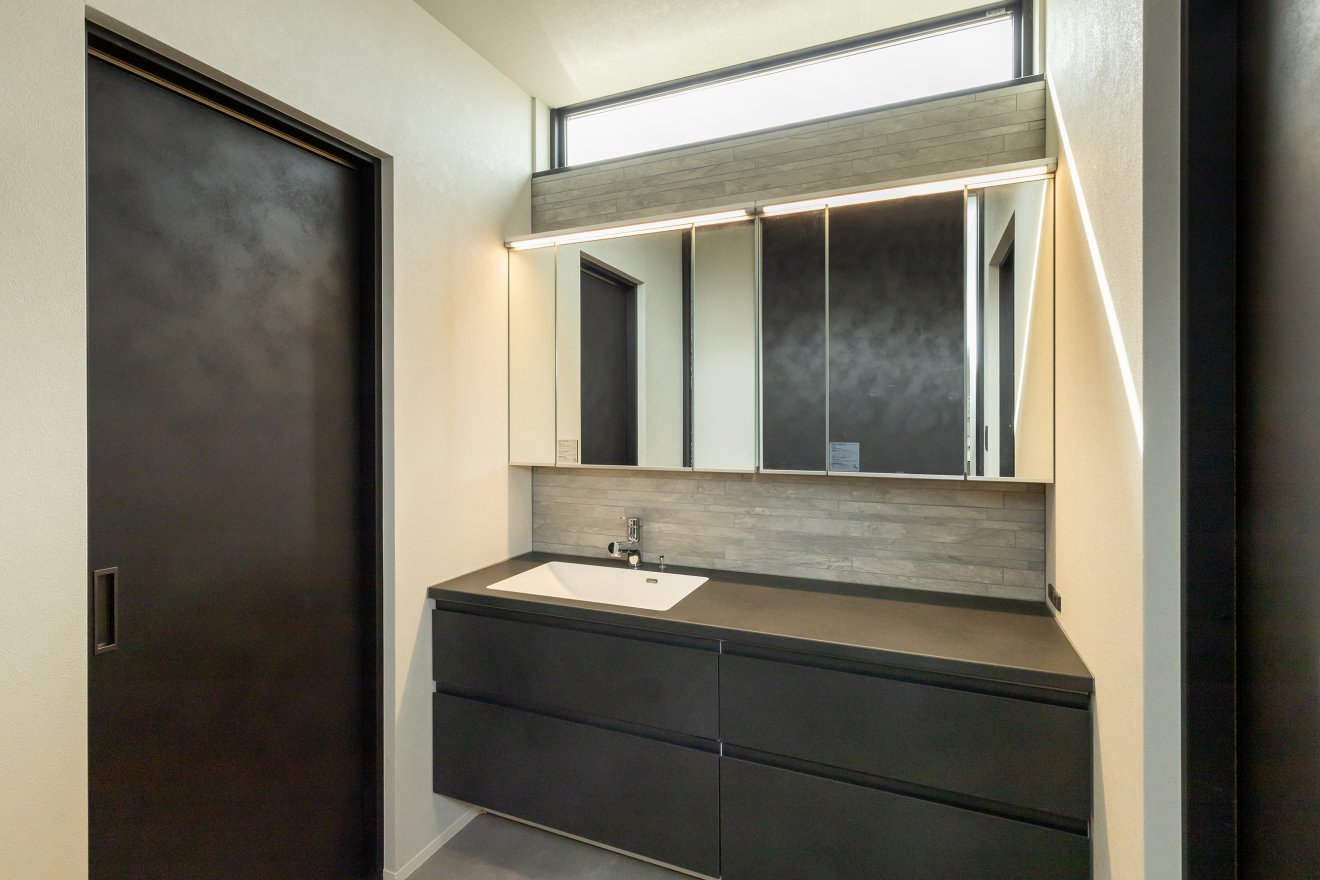 【洗面】ブラック系で統一した幅1650mmの洗面台の上部には、同サイズのFIX窓を配置し、室内に明るい自然光を取り込みます。正面には重厚感のあるアクセントタイルで仕上げました。 【ランドリールーム】洗濯機横にガス乾燥機「乾太くん」を設置しました。