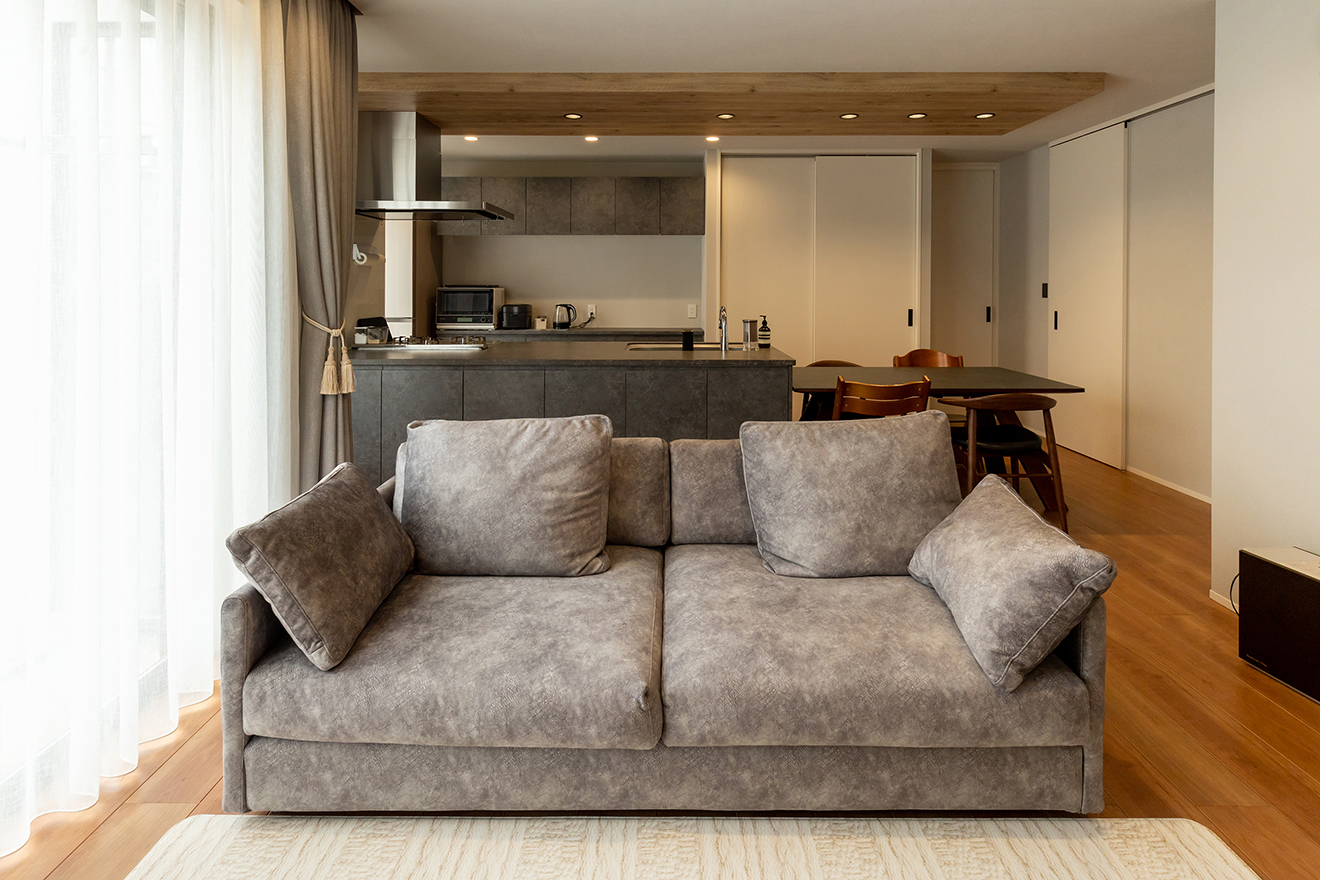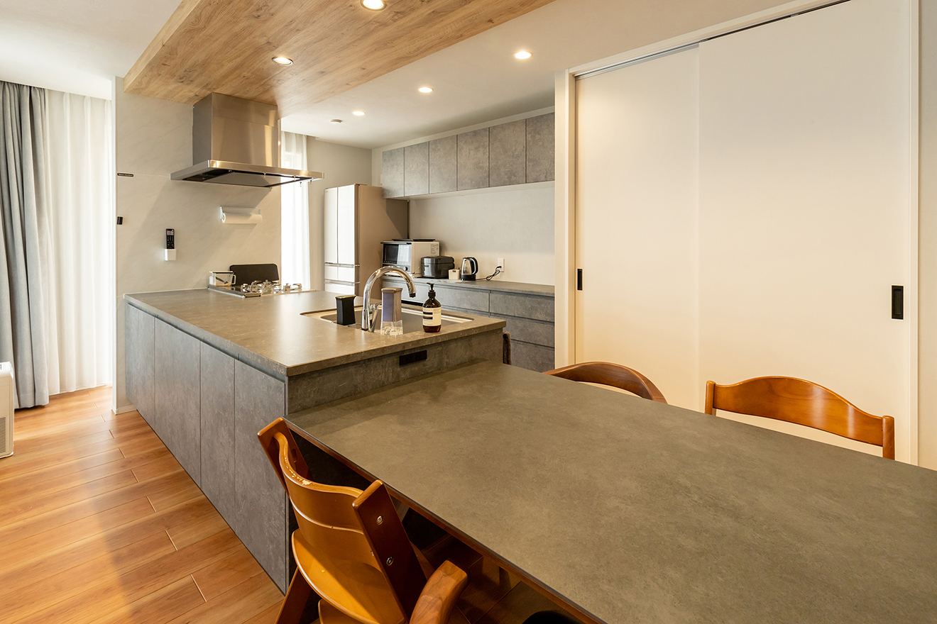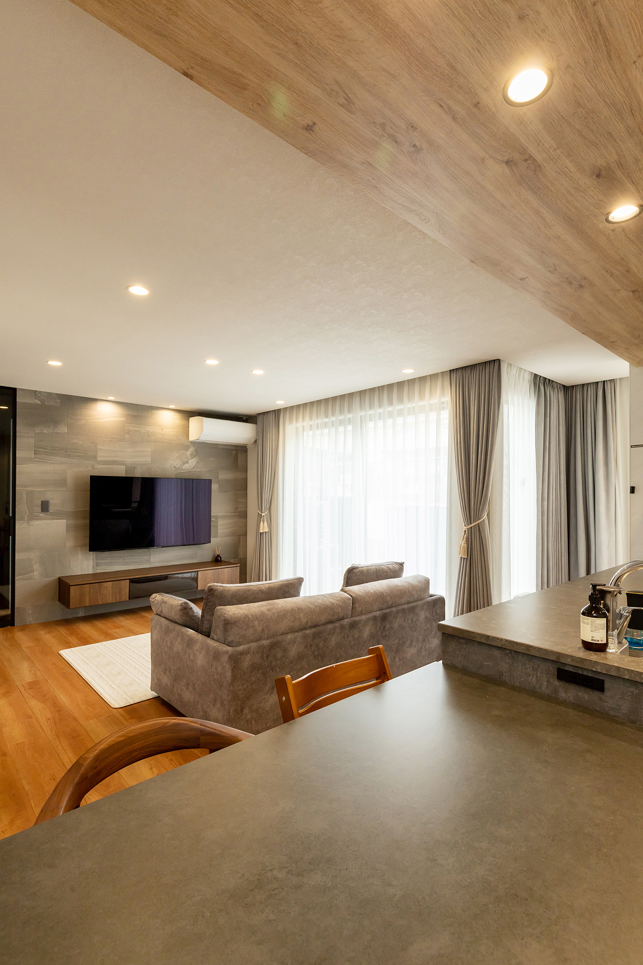 【LDK】リビング・ダイニング・キッチンが一体となり、どこにいても家族のつながりを感じられます。 【ダイニングキッチン】折下げ天井の木とグレーのインテリアが映える、人気の横並び一体型ダイニングキッチン。
