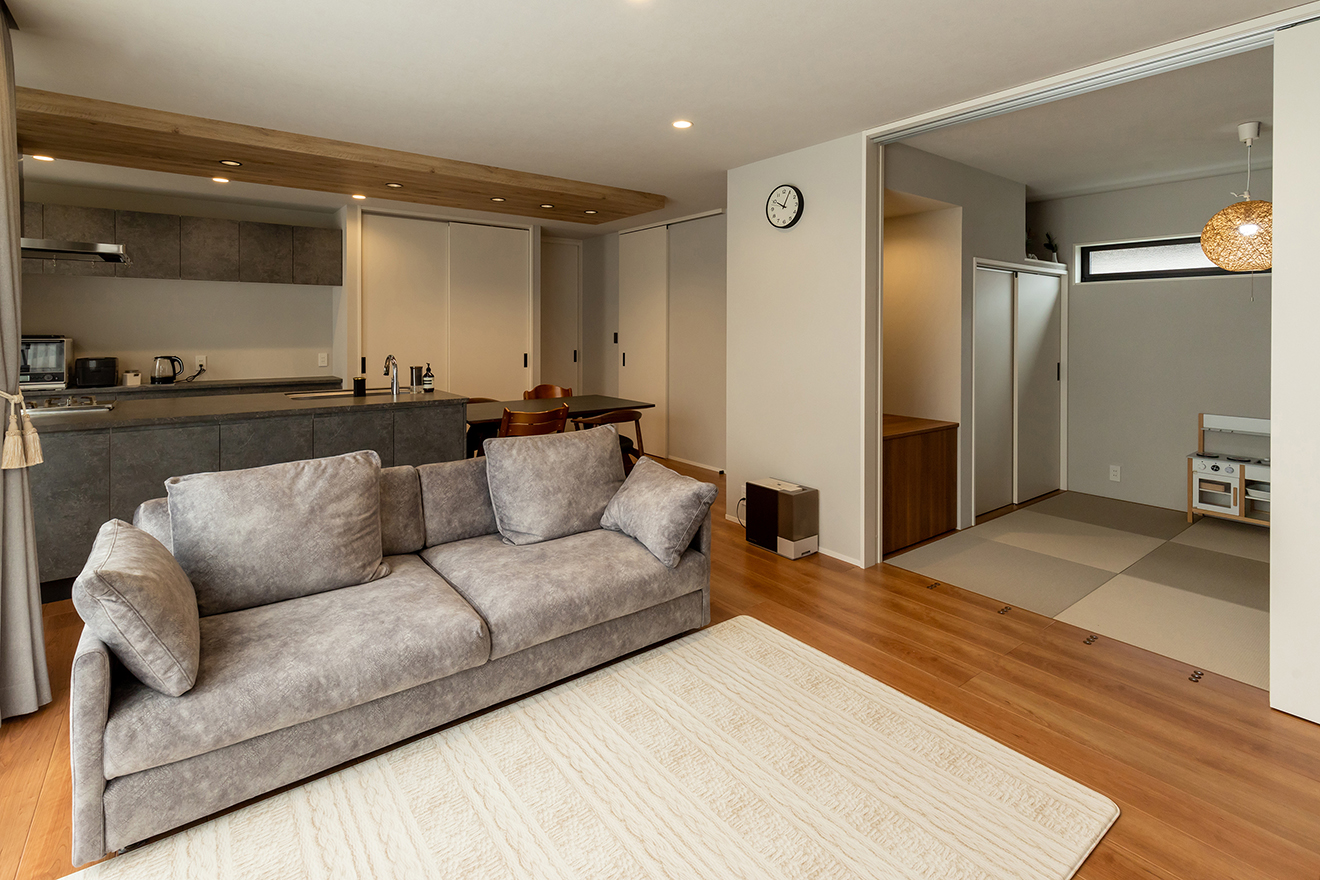 【LDK】リビング横の和室は子育て世代にぴったり。快適な畳で赤ちゃんも安心して過ごせ、家事の合間に様子を見守れます。