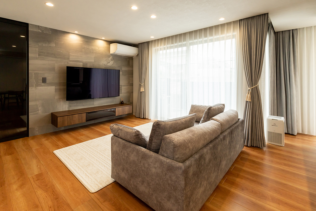 【和室】ひな人形や五月人形を飾れる棚を設置。下部は収納スペースとしても活用可能です。 【リビング】エコカラットと壁掛けテレビの組み合わせで、洗練されたホテルライクな雰囲気に。