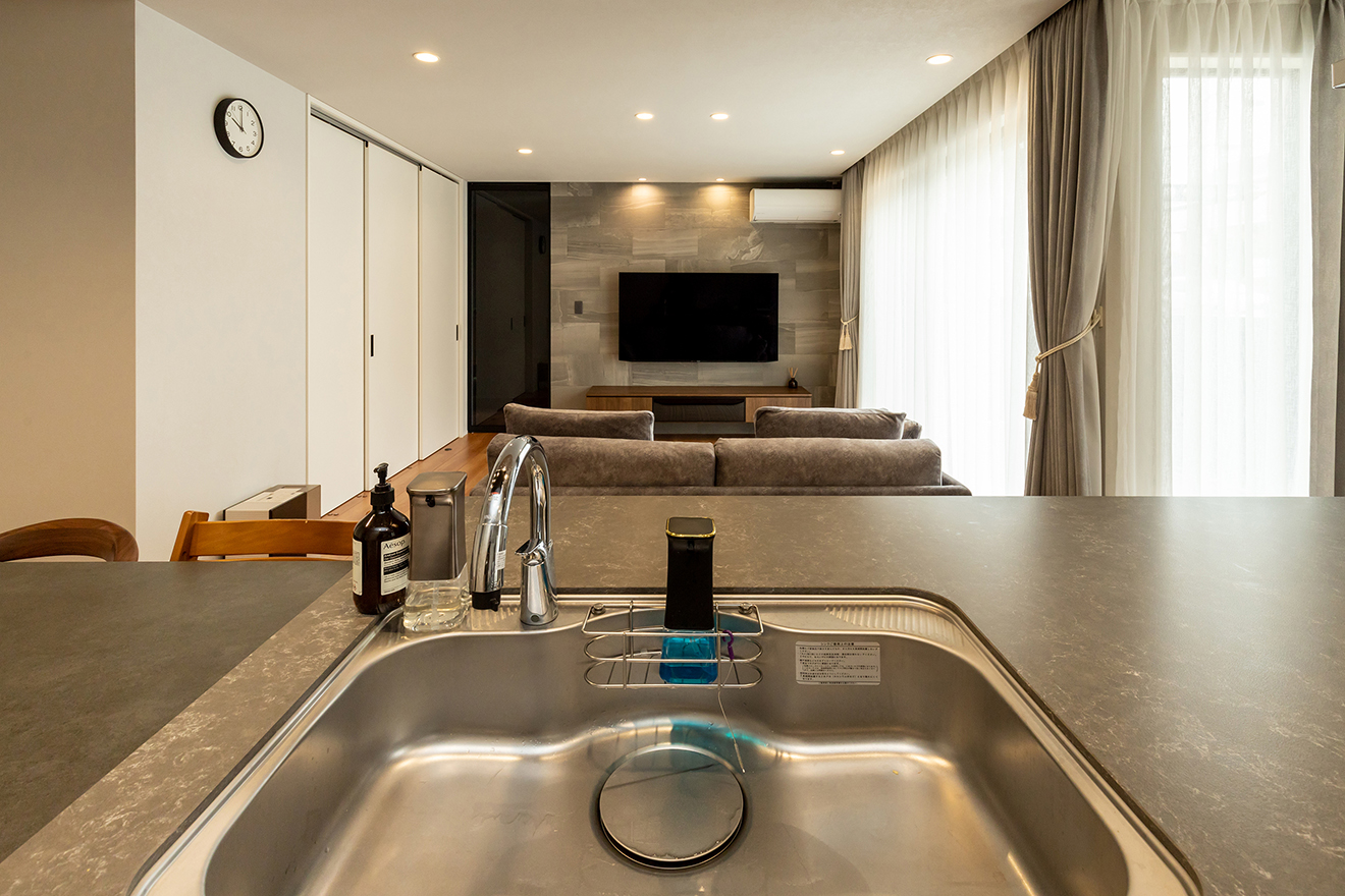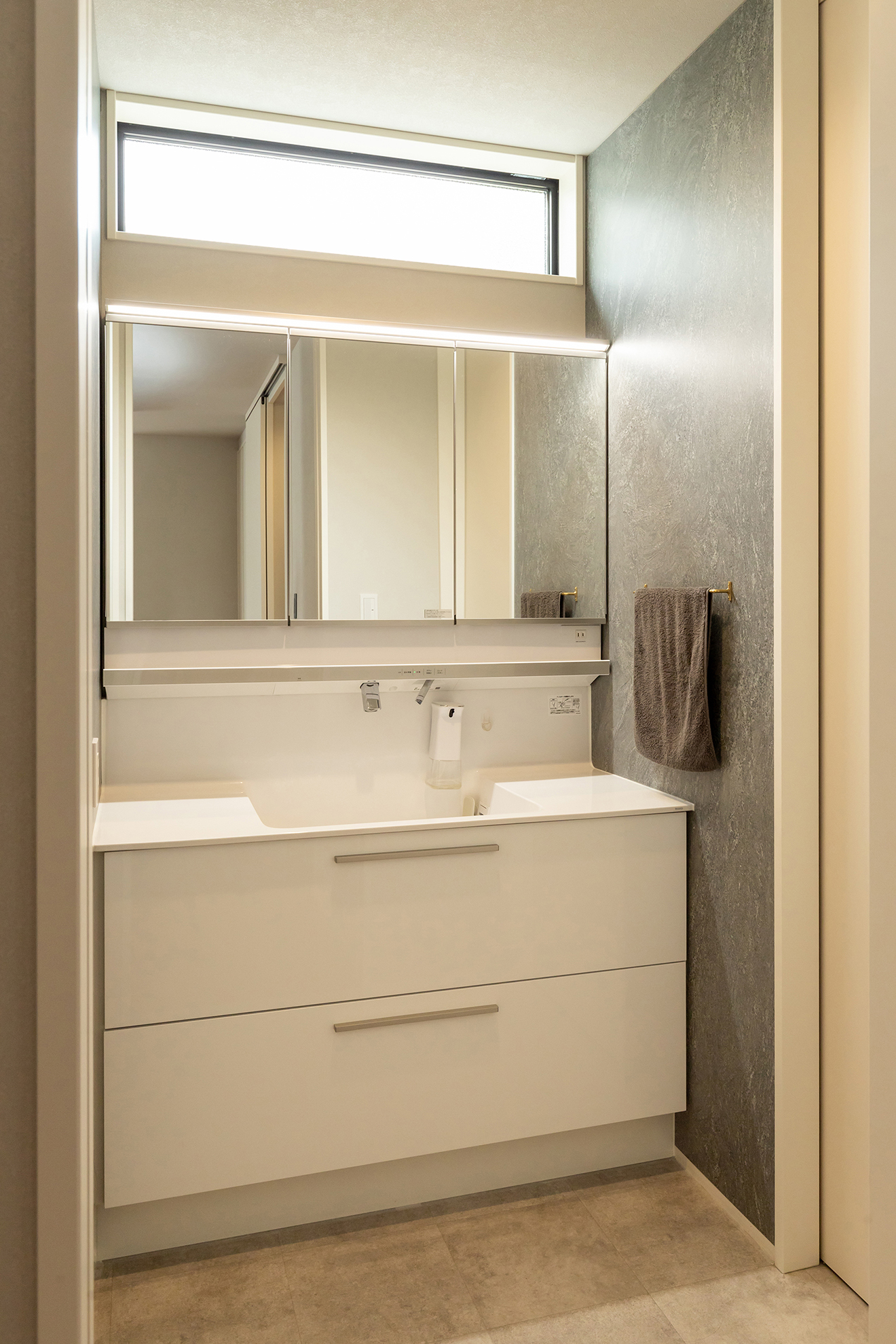 【キッチン】テレビを見ながら家族と会話を楽しみつつ料理ができます。 【洗面化粧台】上部の窓から明るい光が差し込み、爽やかで健康的な雰囲気をつくります。