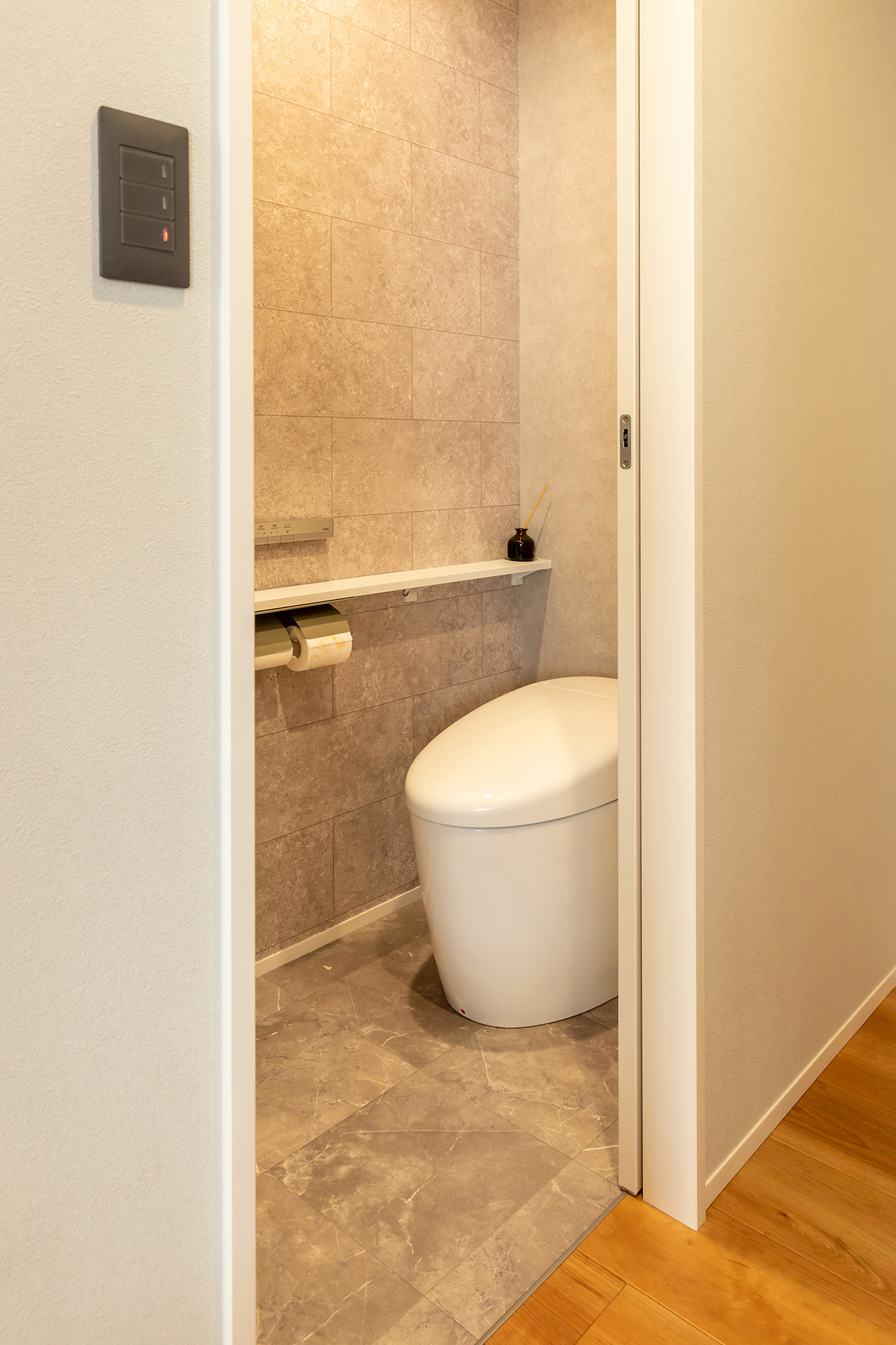 【ランドリールーム】アイアン製の洗濯バーを設置し、使わない時もインテリアのアクセントに。 【トイレ】モノトーン配色でまとめたシンプルモダンなデザイン。