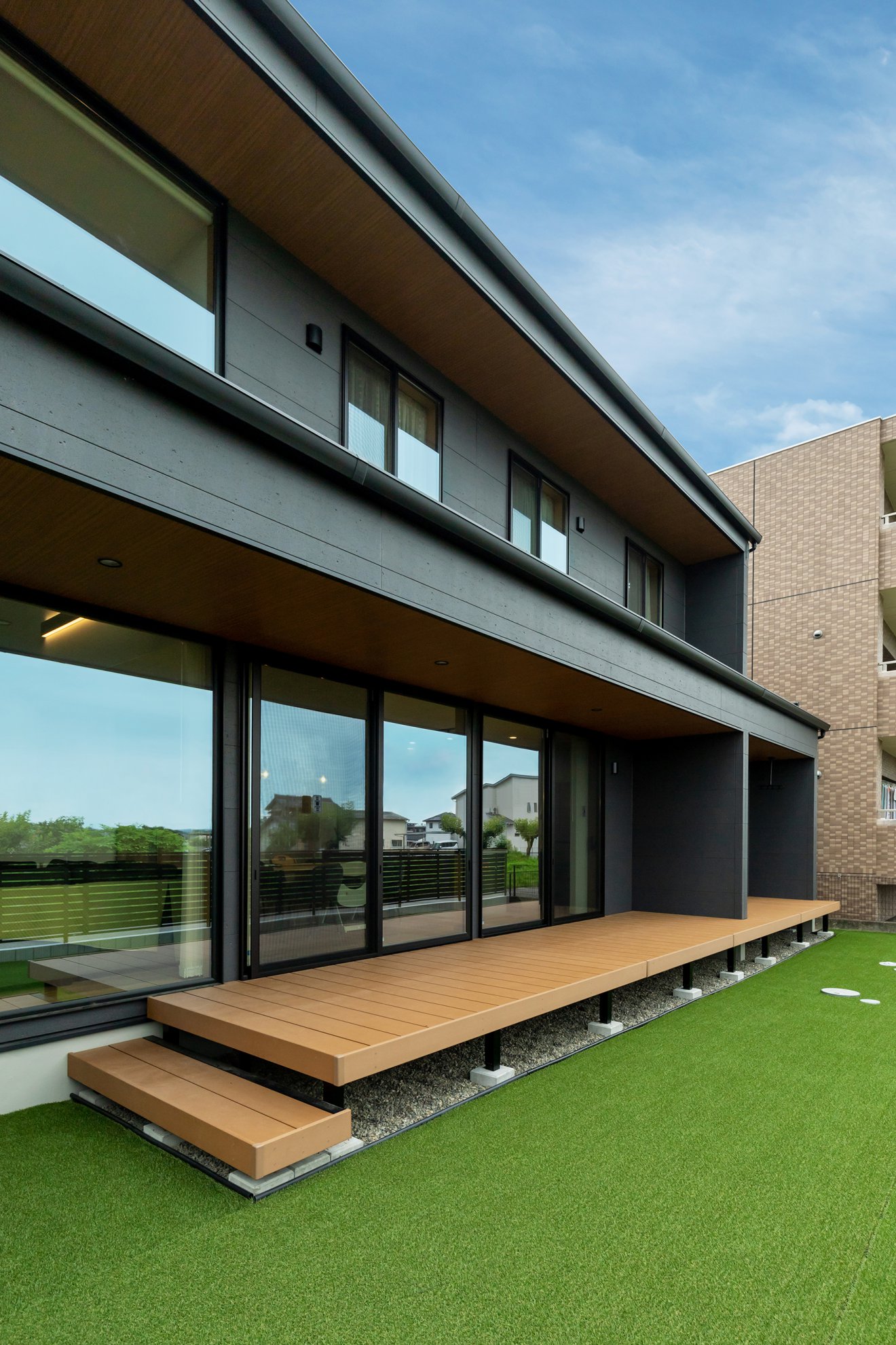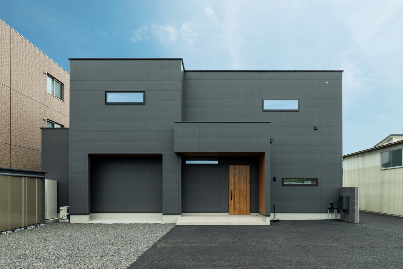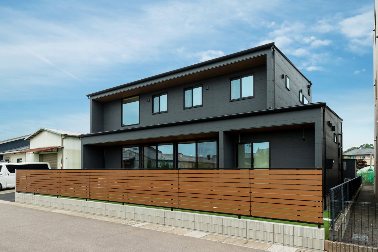 【外観】重厚感のある黒の外観に木目調の玄関ドアがアクセントとなり、落ち着いた佇まいにやさしい彩りを添えています。 夏の日差しをやわらげる軒のあるデザイン。シックな黒の外観に目隠し塀と木目調の軒天が心地よいアクセントに。