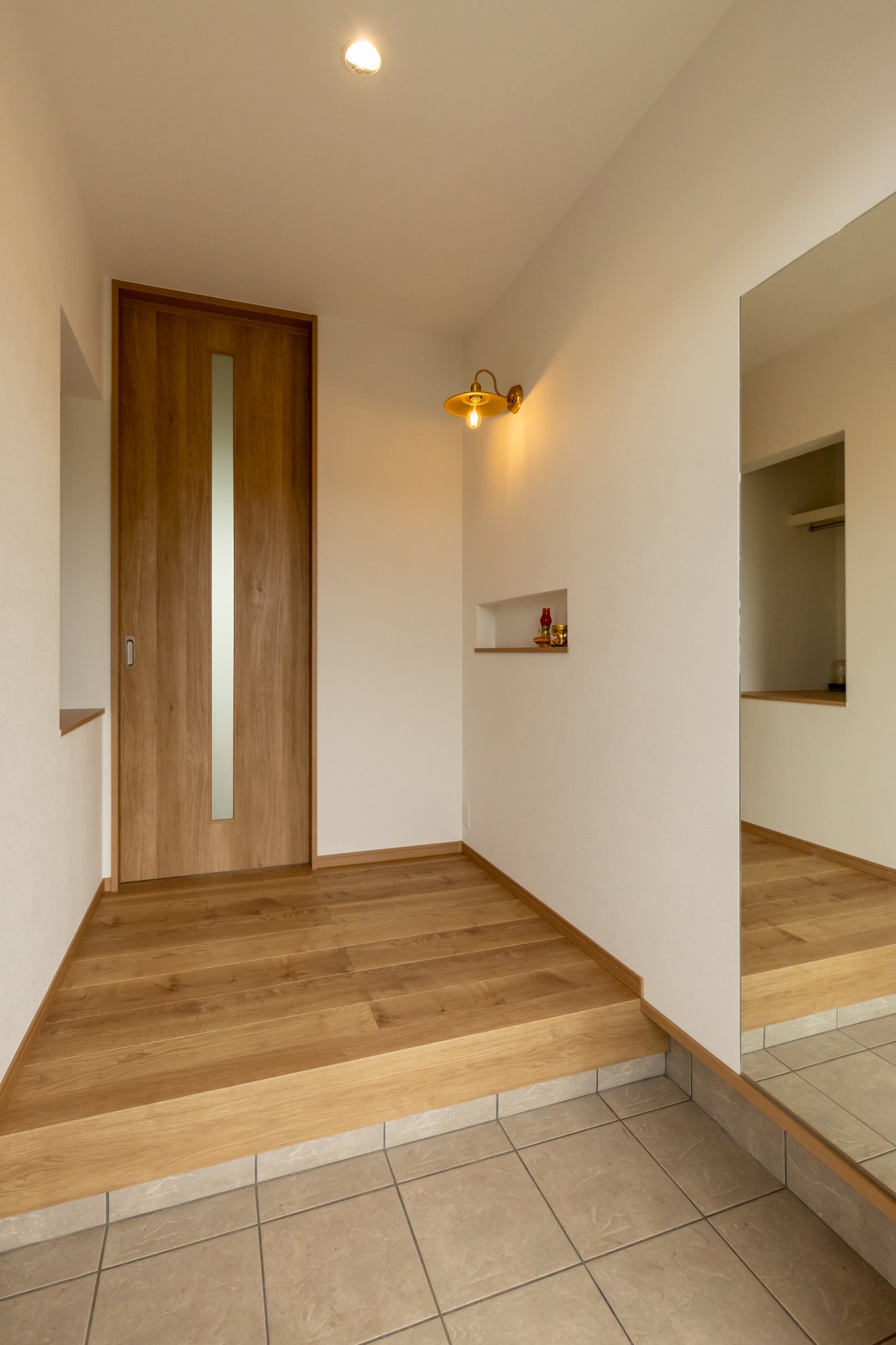 【外観】大きな窓からは豊かな自然光が差し込み、深い軒が直射日光をやわらかく遮ります。ウッドデッキでは休日に心地よいひとときをゆったりと楽しむ、贅沢な時間が広がります。【玄関】天井まで伸びたリビングドアがすっきりとした印象と程よい重厚感をもたらします。壁面のニッチスペースは飾りつけが楽しみになる心弾む空間です。