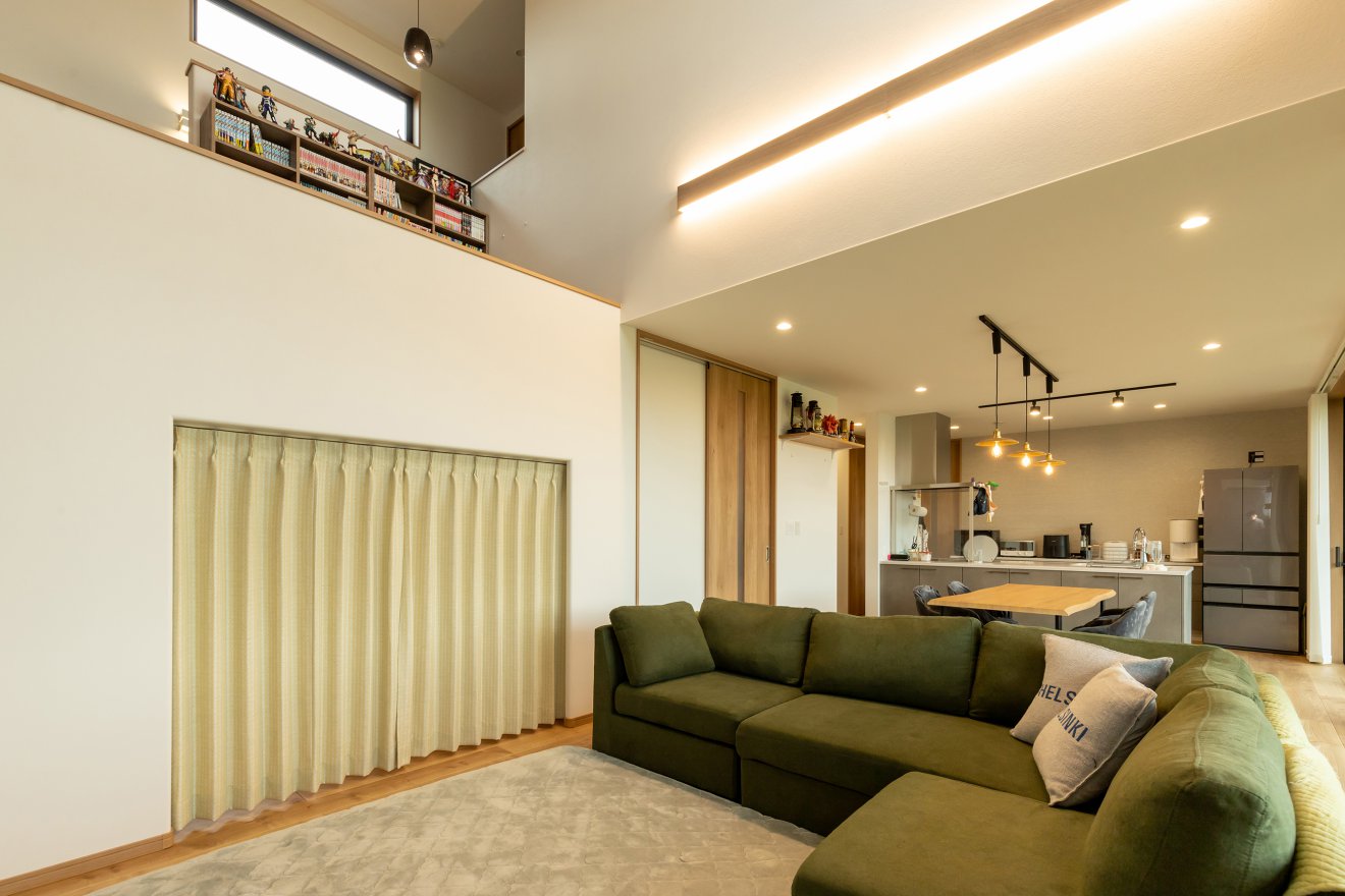 【LDK】リビング、スキップフロア、ヌックがつながる吹き抜けのあるLDK。程よい高さの違いが家族の気配を感じながらも、それぞれの時間を楽しめる距離感を生み出します。広々とした吹き抜け空間に一面のアクセントクロスをあしらい、迫力ある印象的なデザインに仕上げました。