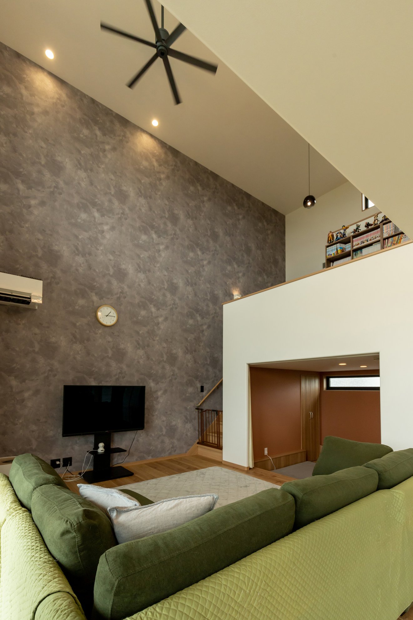 【ヌック】掘り込みの側面には板張りを施し、壁面は漆喰風のクロスで仕上げました。心地よく癒される、こもり感を演出しました。【吹き抜け】猫ステップのある吹き抜けは我が家らしさを象徴する空間。窓辺のキャットウォークで朝日を浴びるのが猫の日課となっています。