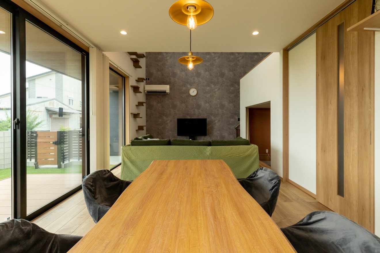 【LDK】キッチンに立ちながら家族の様子を見渡せるように設計しました。南面のハイサッシ越しに庭で遊ぶお子さまの姿が見え、いつでも繋がりを感じられます。