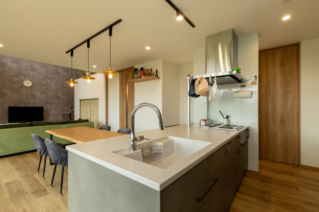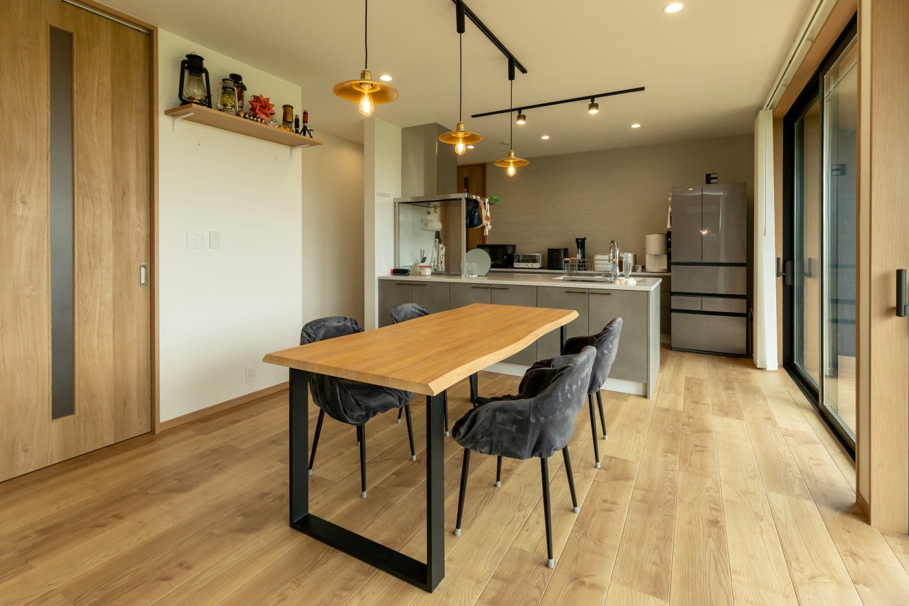 【LDK】ダイニングテーブルの上には、やわらかな明かりを灯すペンダントライトを配しました。フラットキッチンからダイニング、リビングを一望できます。アイランドキッチン風の設計により優れた回遊性も実現。