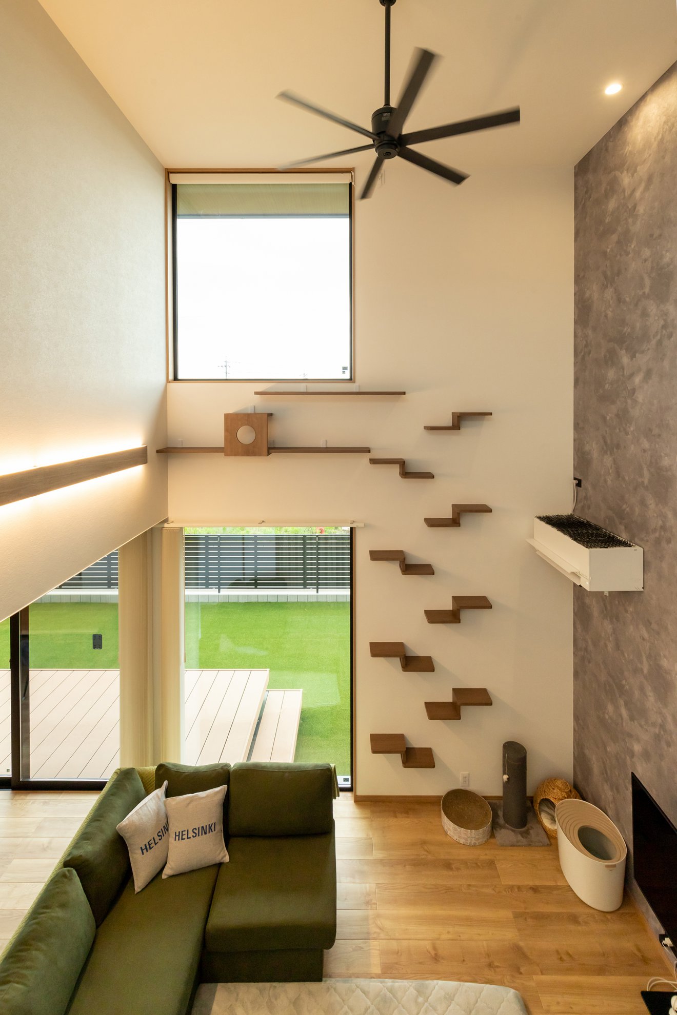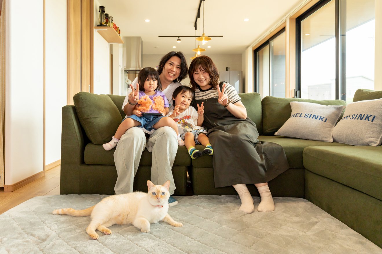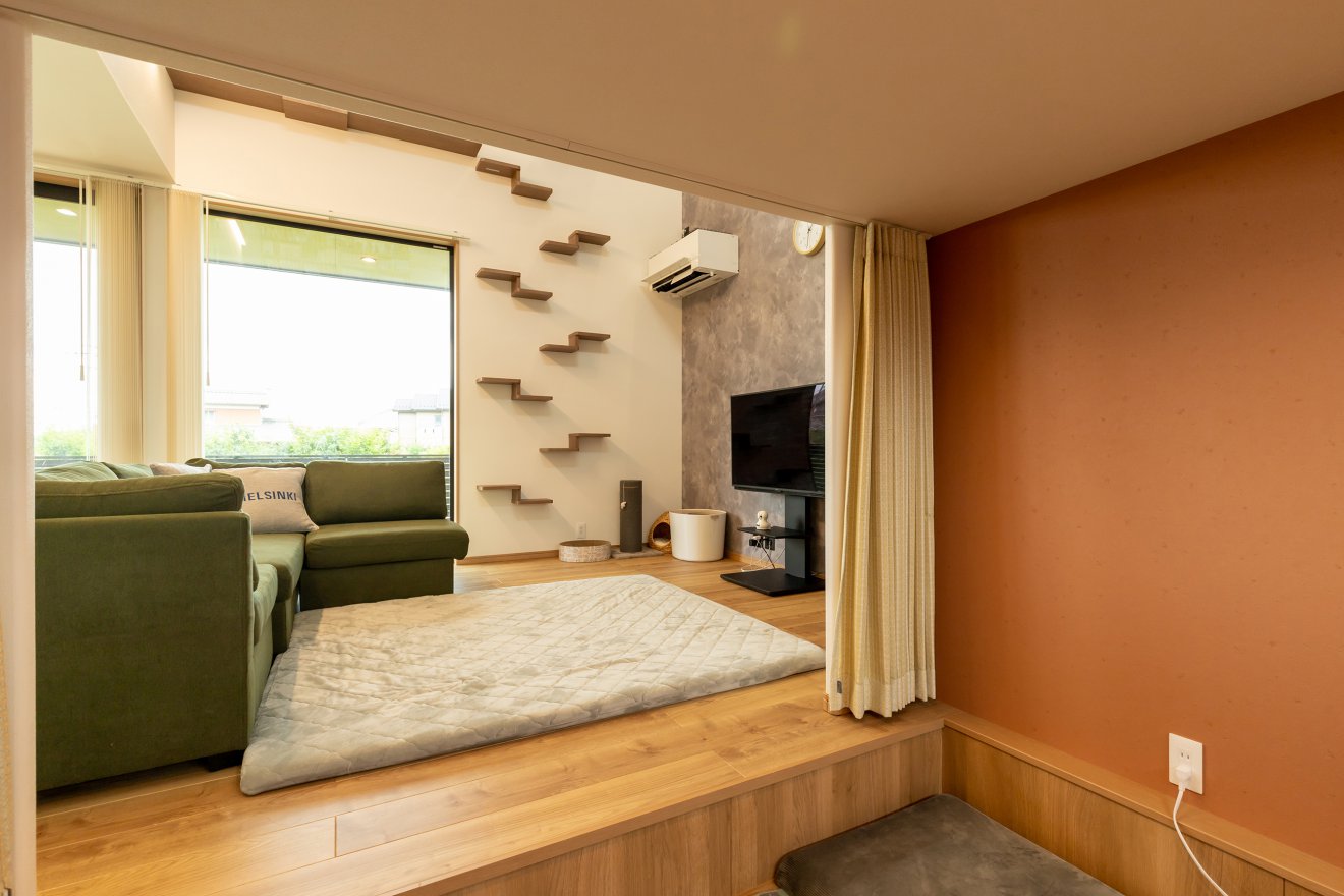 【Life style】ご家族と愛猫が自然とリビングに集まれる間取りを設計しました。何気ない日常も、楽しい思い出にあふれる空間です。 猫ちゃんがまったり寛げるお気に入りの場所。