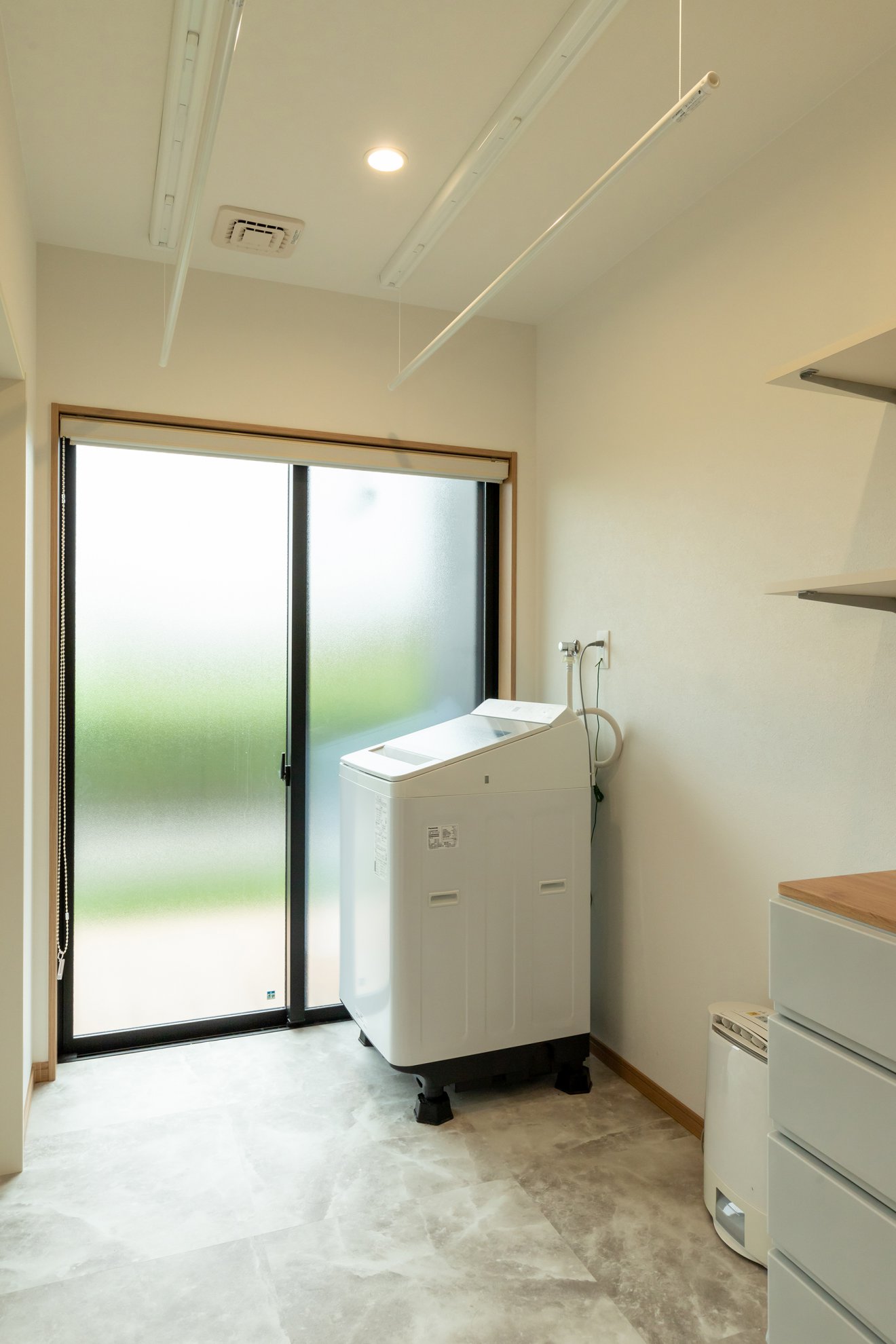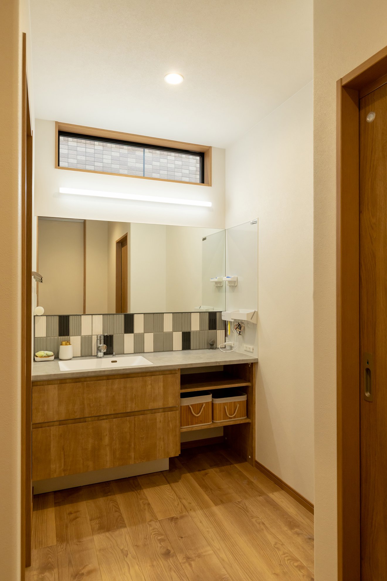 【洗面】すっきりとした一面鏡の下部に凹凸のあるタイルを用い、ランダムにカラーを配置しました。【ランドリールーム】昇降式の室内物干しを設け、使い勝手に配慮。外干しができるように設置した掃き出しサッシも便利です。