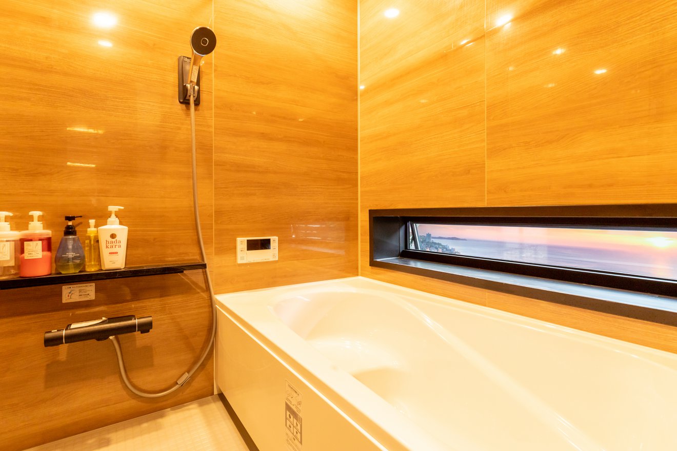 【UB】坪庭を望められるように低い位置に横長窓を配置。湯船に浸かりながら、坪庭に貼った風景パネルを静かに楽しめます。