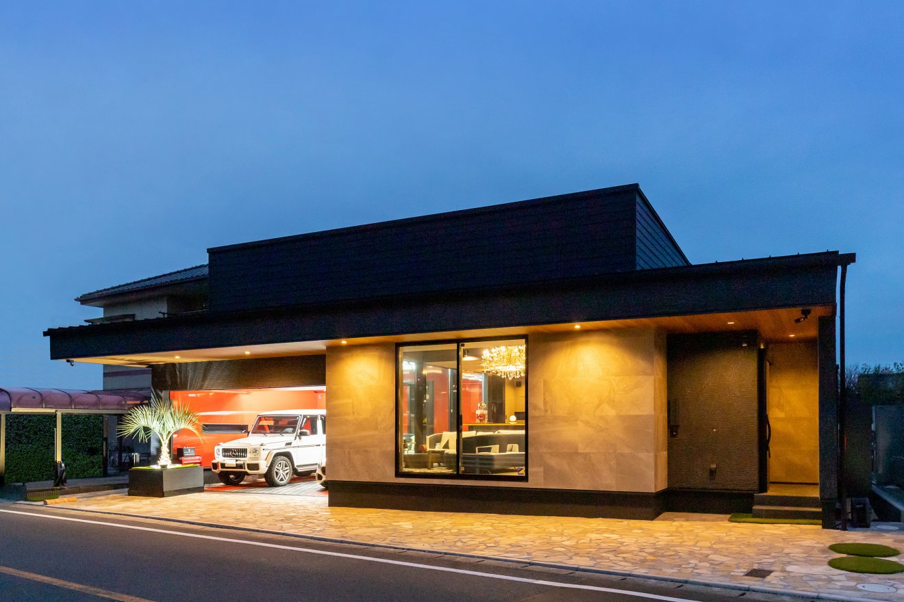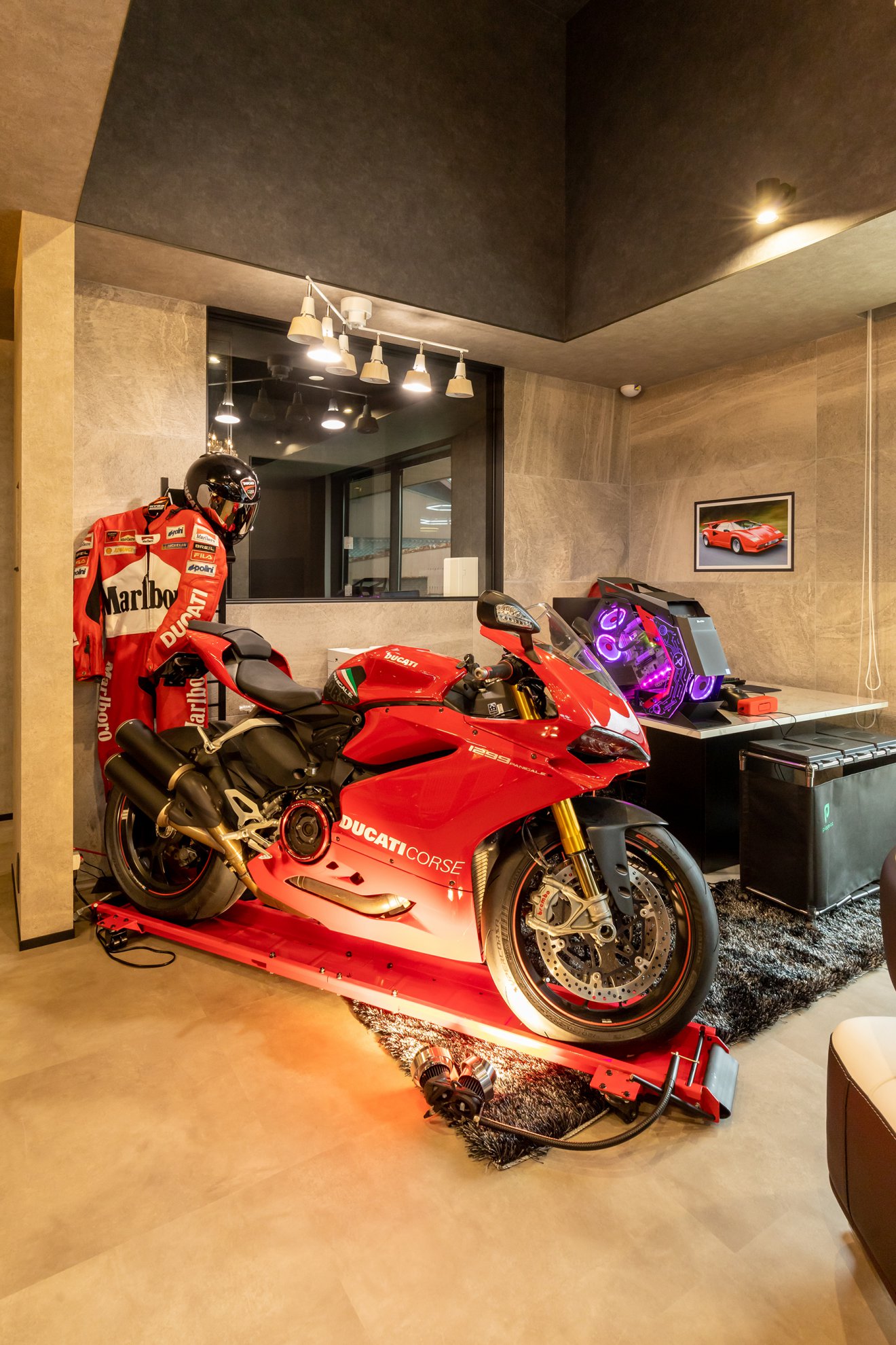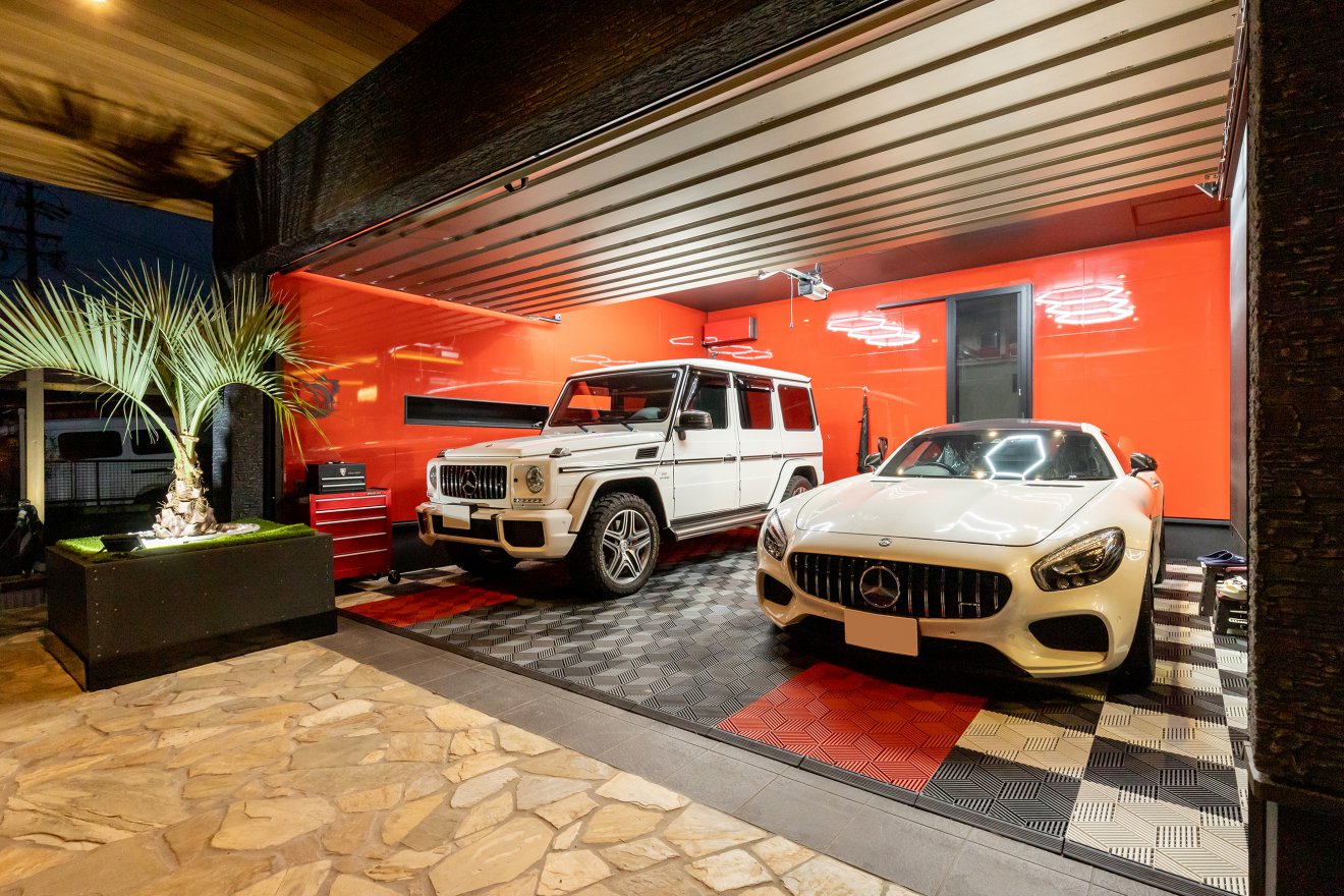 【ガレージ】壁は艶やかなレッド、床はチェッカーフラッグ柄のマットでスポーティに仕上げました。オーバースライダーシャッターが開放感を演出します。 【外観】外壁上部にはダークグレー色のガルバリウム鋼板を張り、下部のアクセントにライトグレー色の大判タイルを組み合わせました。ダウンライトの陰影でタイルがより映えます。