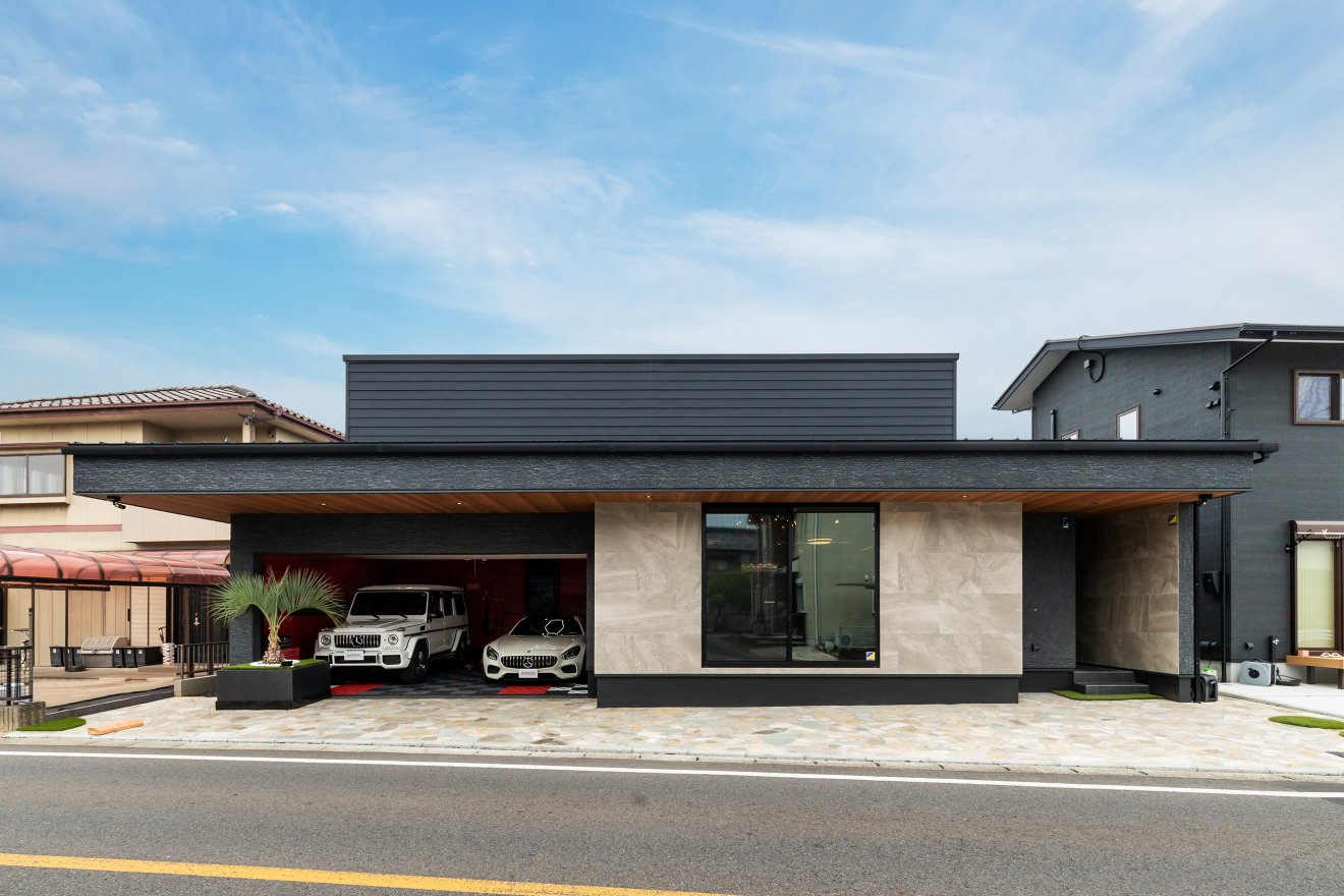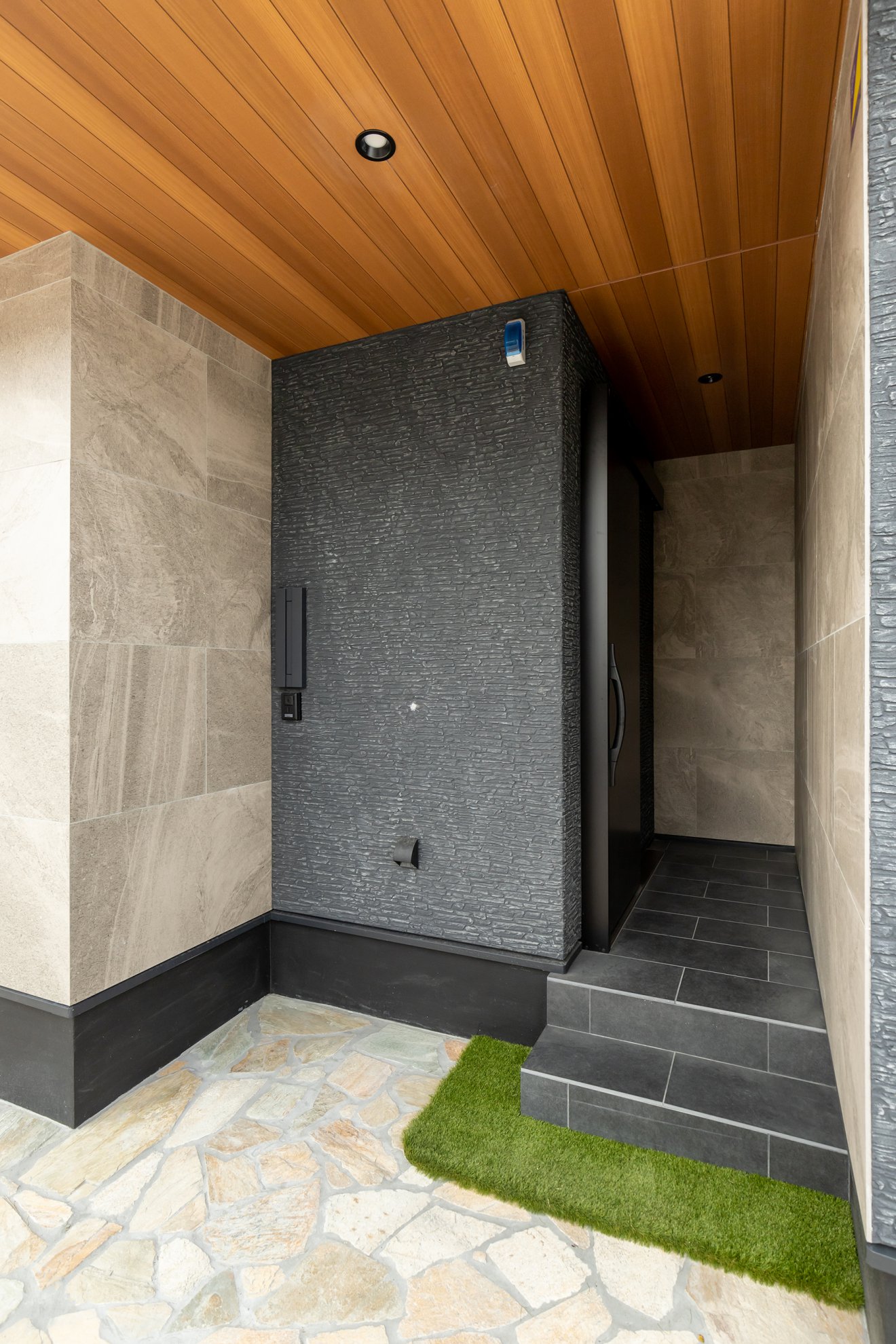 【ガレージ】横幅6mと奥行6mの余裕があるガレージ。大型の車両が2台駐車可能です。 【玄関】木目軒天が視線を奥へと誘う、奥行きのある玄関ポーチ。あえてスペースを限定的に設計することで、玄関ドアを開けた瞬間の開放感を際立たせています。