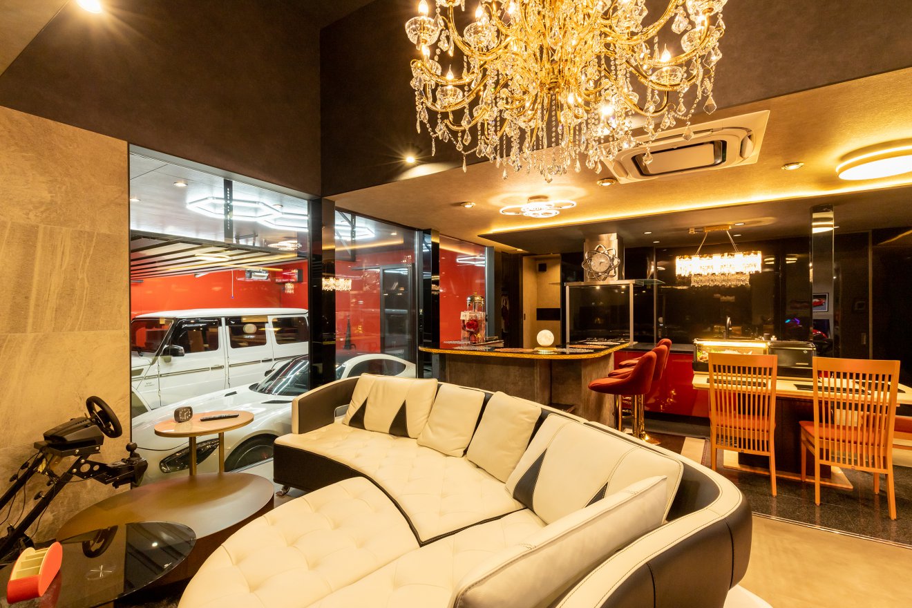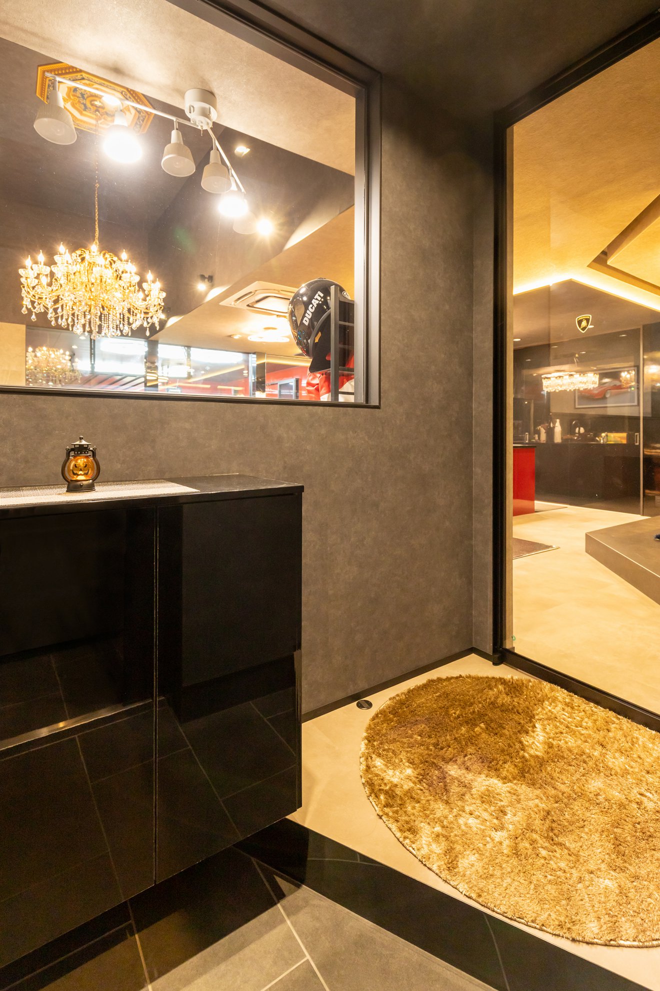 【玄関】ホールからLDKへと視線が抜ける室内窓を設置しました。リビングの華やかな印象を共有し、広がりと一体感のある空間を演出。 【LDK】大開口のガラス窓によってガレージと居住空間をシームレスに共有。愛車を展示するという発想が、空間に圧倒的な開放感とドラマチックな演出をもたらします。