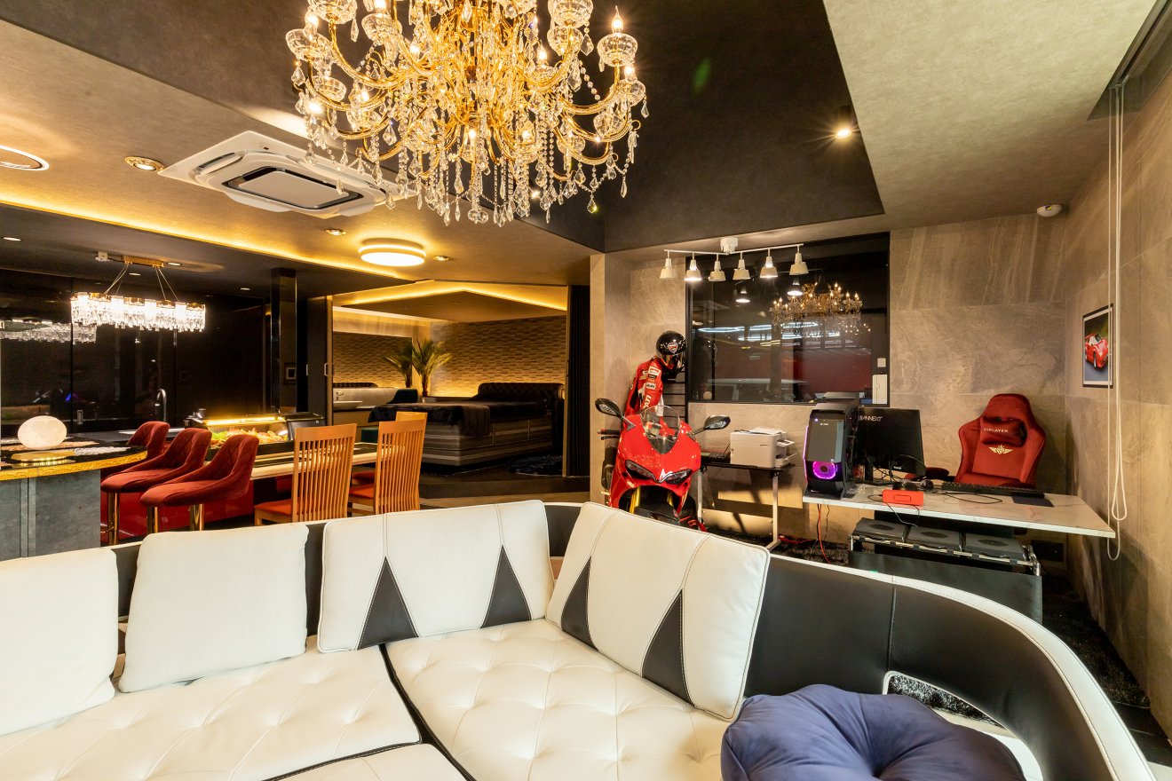 【LDK】一部の高さを4mに折り上げた天井からはシャンデリアが煌めき、空間の主役として全体を華やかに彩ります。セカンドハウスならではの大胆な設計で非日常の美学を追求しました。