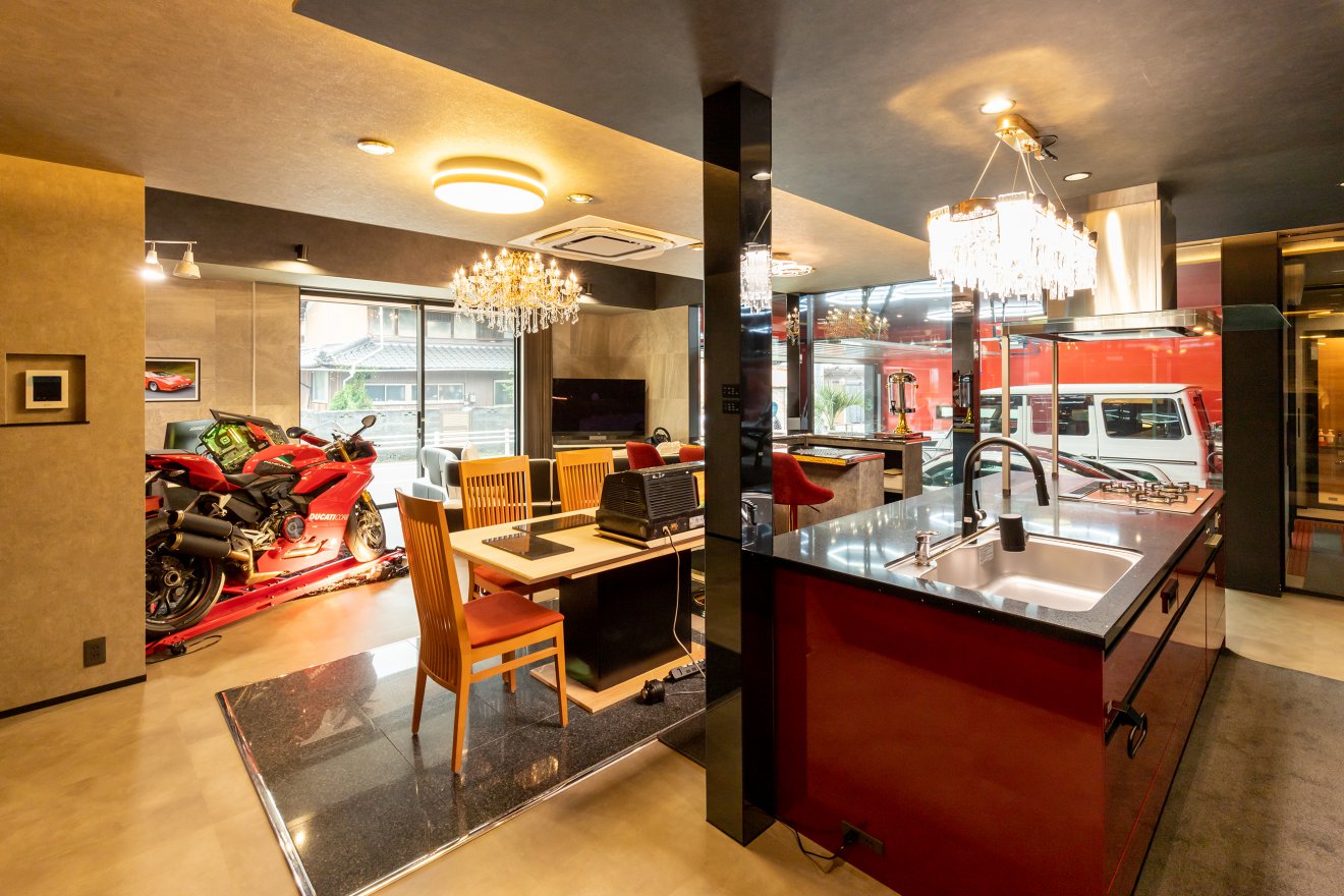 【LDK】フルフラットのアイランドキッチンで高い回遊性を実現。あらわし柱には美しく艶やかな光沢感を宿すブラックミラーを巻いて、圧迫感をなくしつつエレガントな仕上がりに。デスクスペースでは趣味を慈しみ、感性を研ぎ澄ます。愛車のバイクをアートのように配置して愛でる。愛着ある品々に囲まれて、その美しさを愉しみながら、至福のひとときを過ごせます。