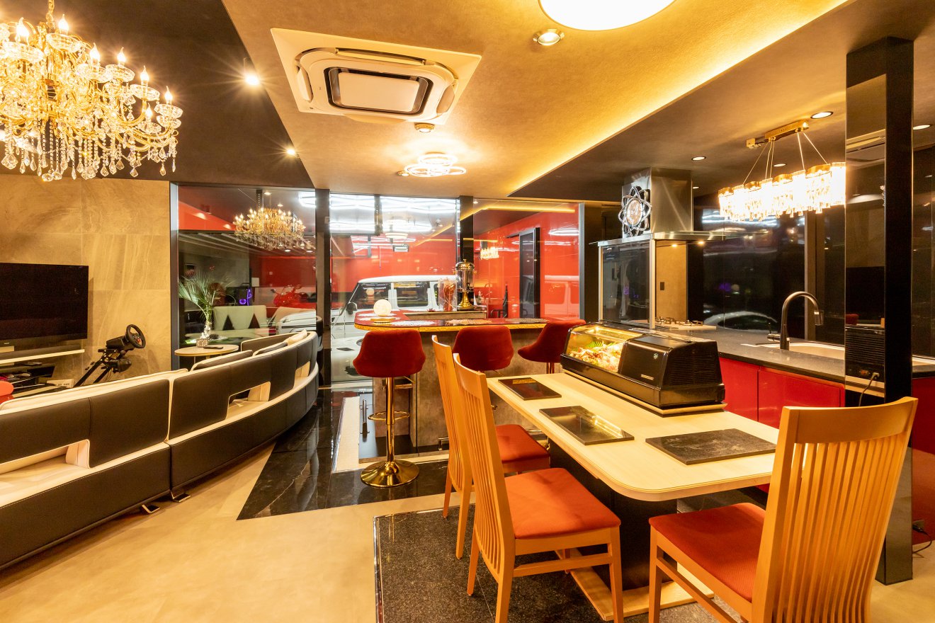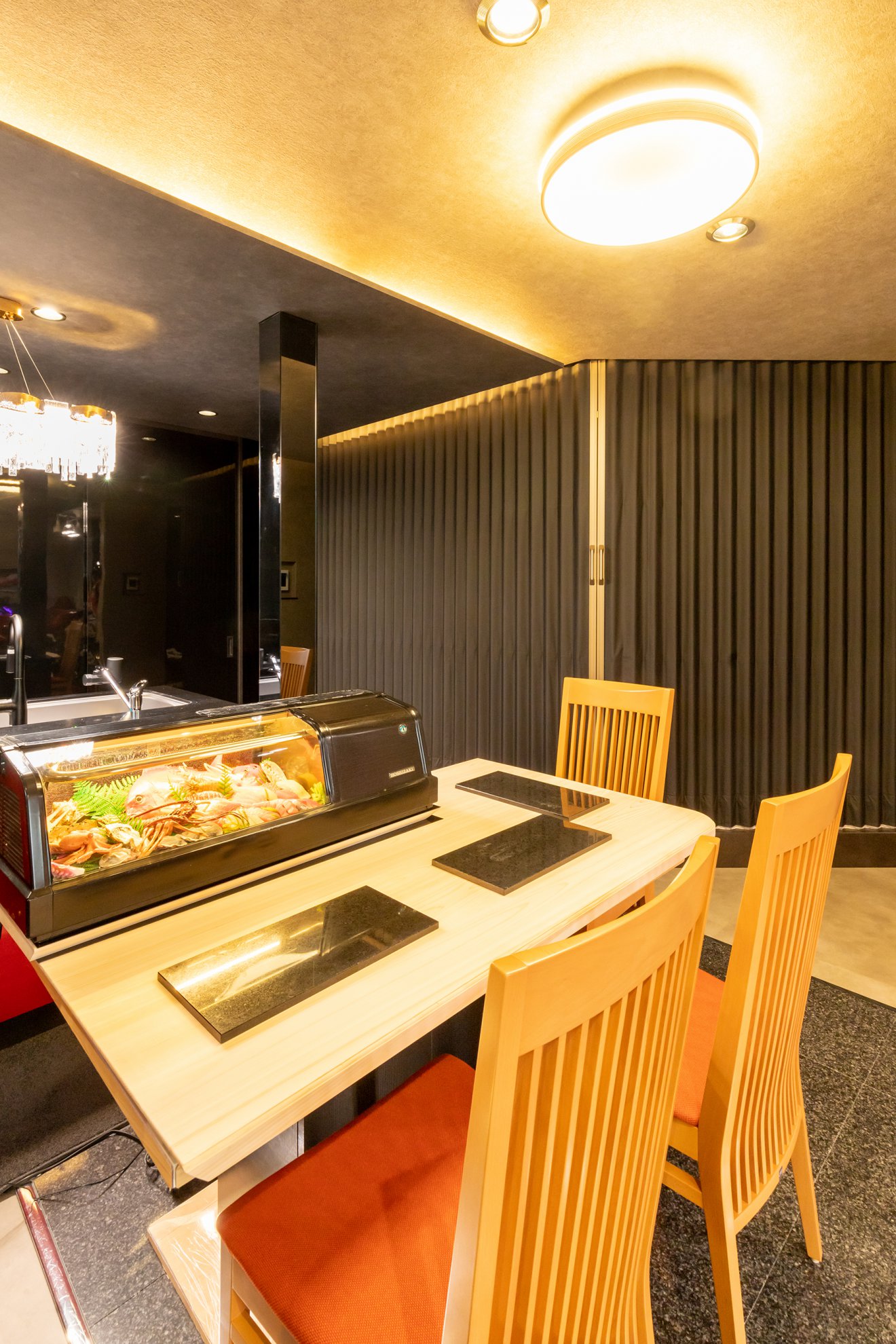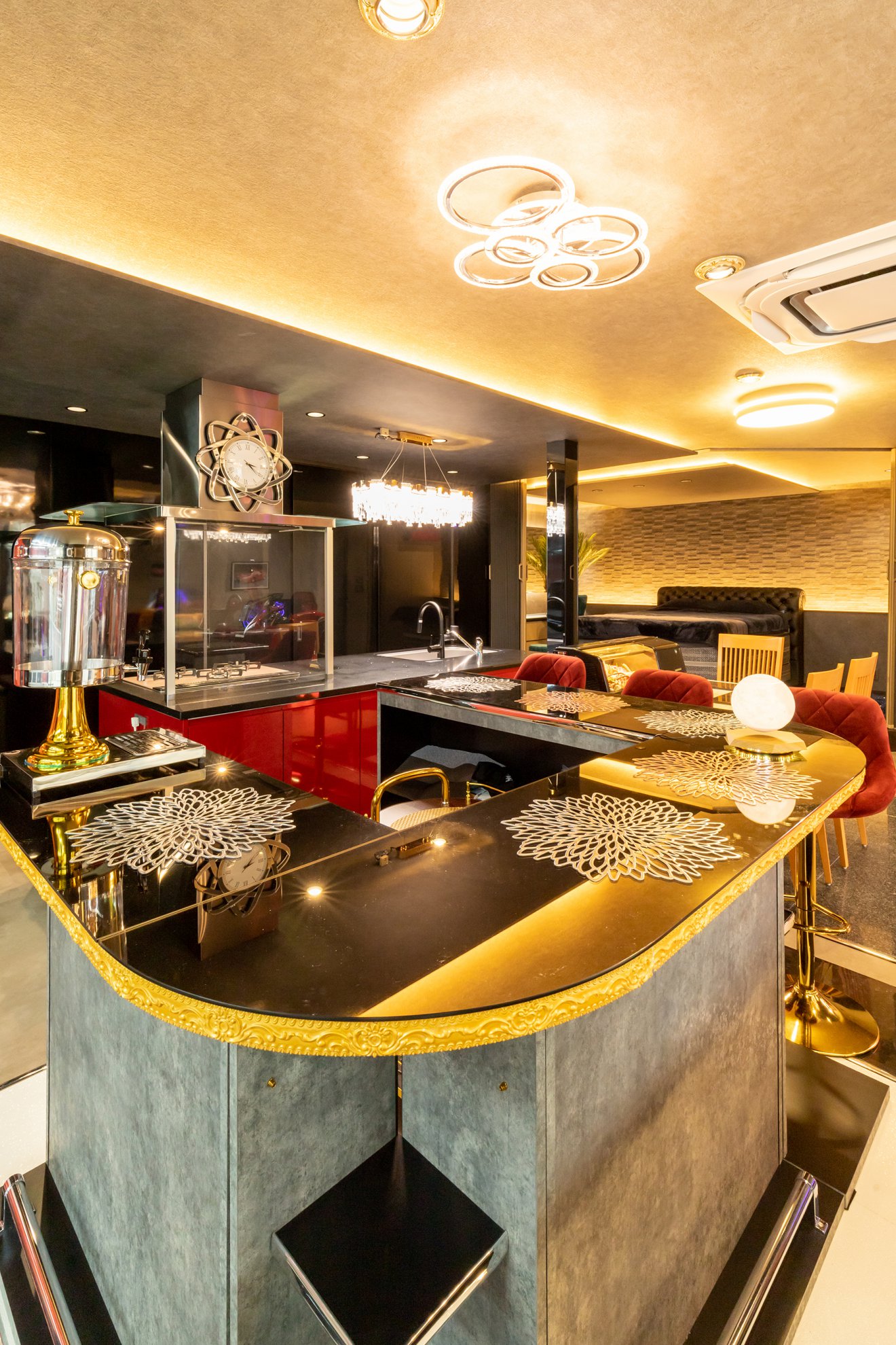 【LDK】バースペースと寿司カウンターを設えた空間は、オーナー様だけでなくゲストと共に心躍るひとときを分かち合うための社交場。折り下げ天井から溢れる柔らかな間接照明が、語らいの時間を優雅に、そして温かく演出。