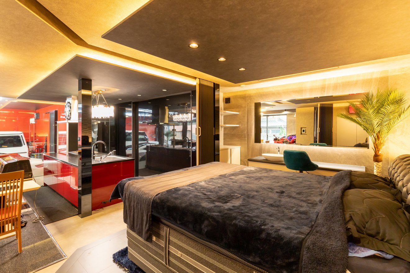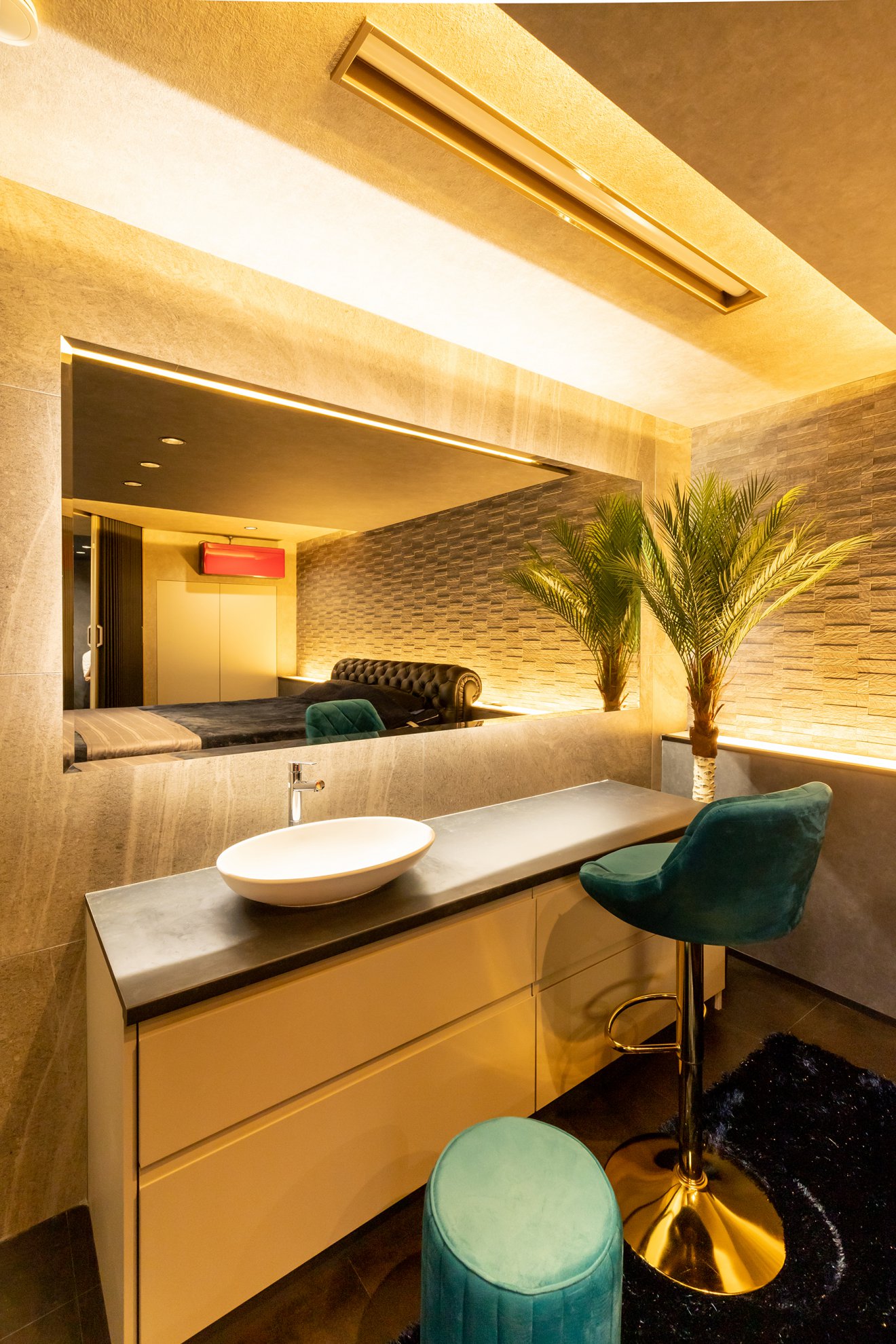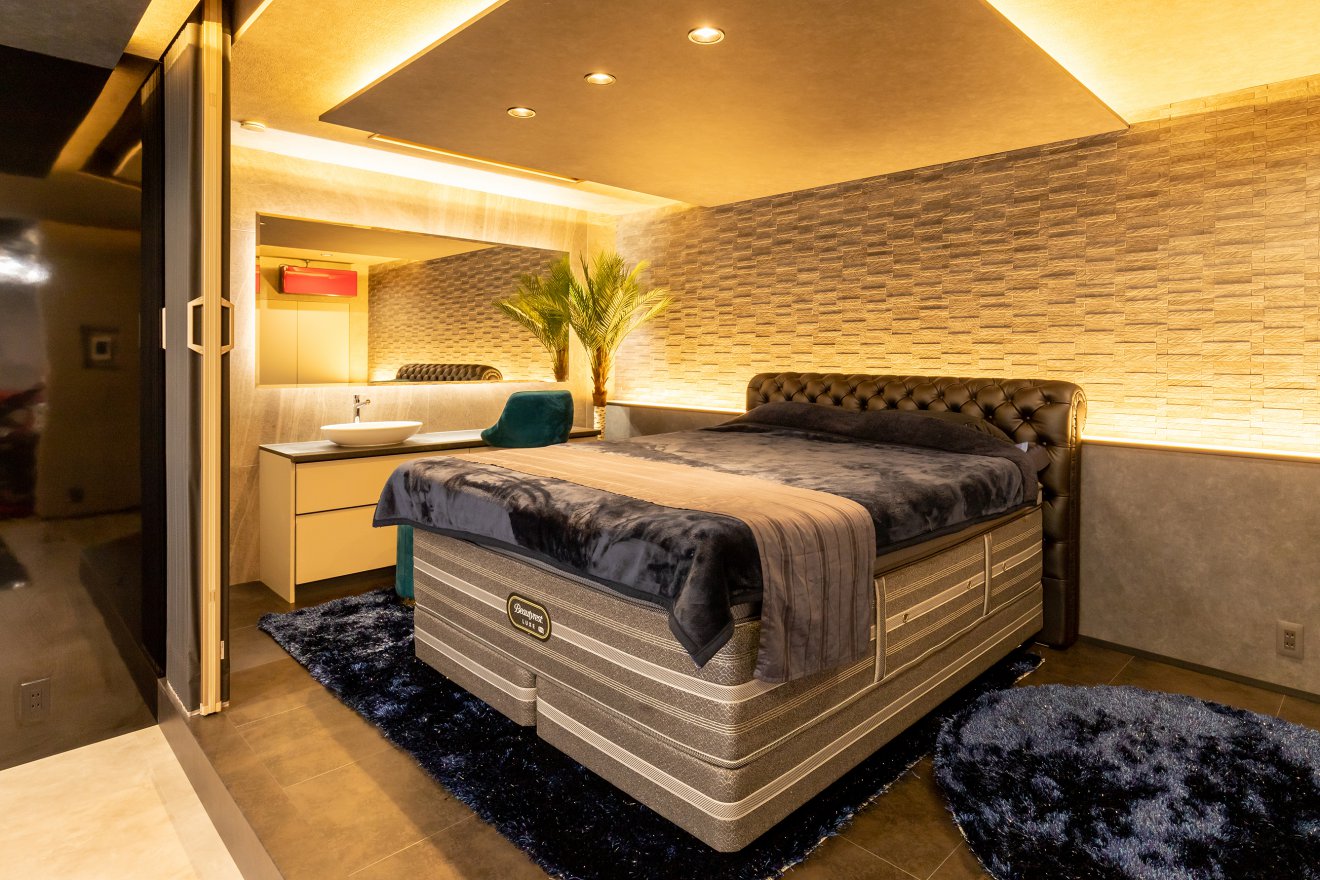 【寝室】グレータイルと間接照明が織りなす、ラグジュアリーなベッドスペース。リビングに隣接するホテルライクな空間デザインです。 【サニタリー】ベッドサイドに設けた、一枚板風の洗面カウンターとワイドミラー。ミラーはテーパーカットを施すことで、洗練された高級感を表現しました。