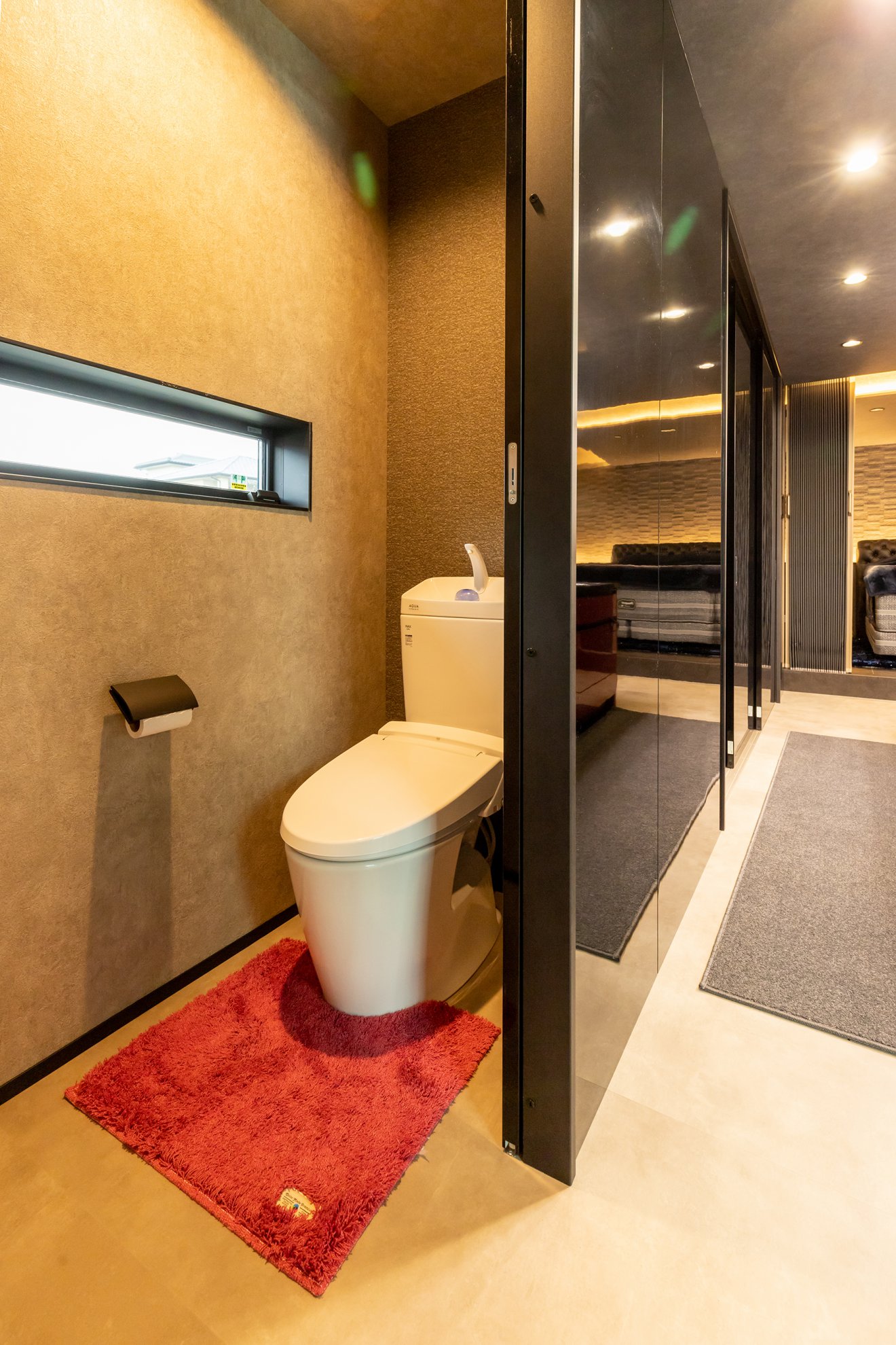 【寝室】ベッドスペースの天井を少し下げて落ち着きある空間になりました。カーテンレールは天井にスリットを入れることで目立たなく配慮。 【トイレ】居室とテイストを合わせてシンプルで統一感を持たせました。