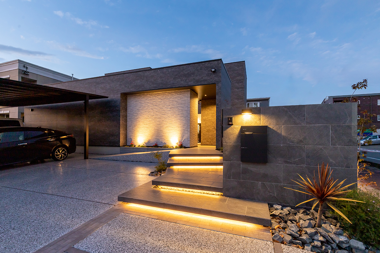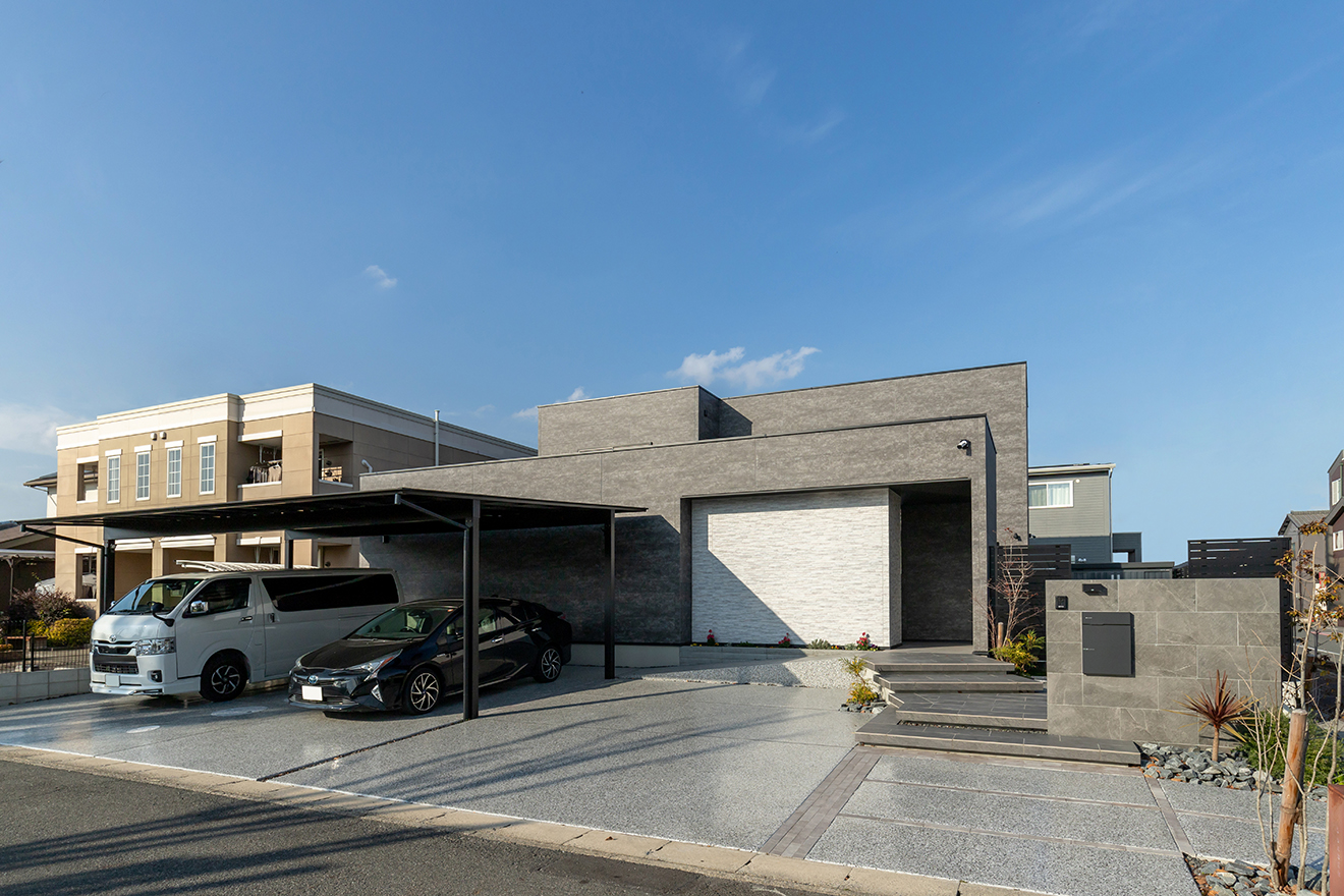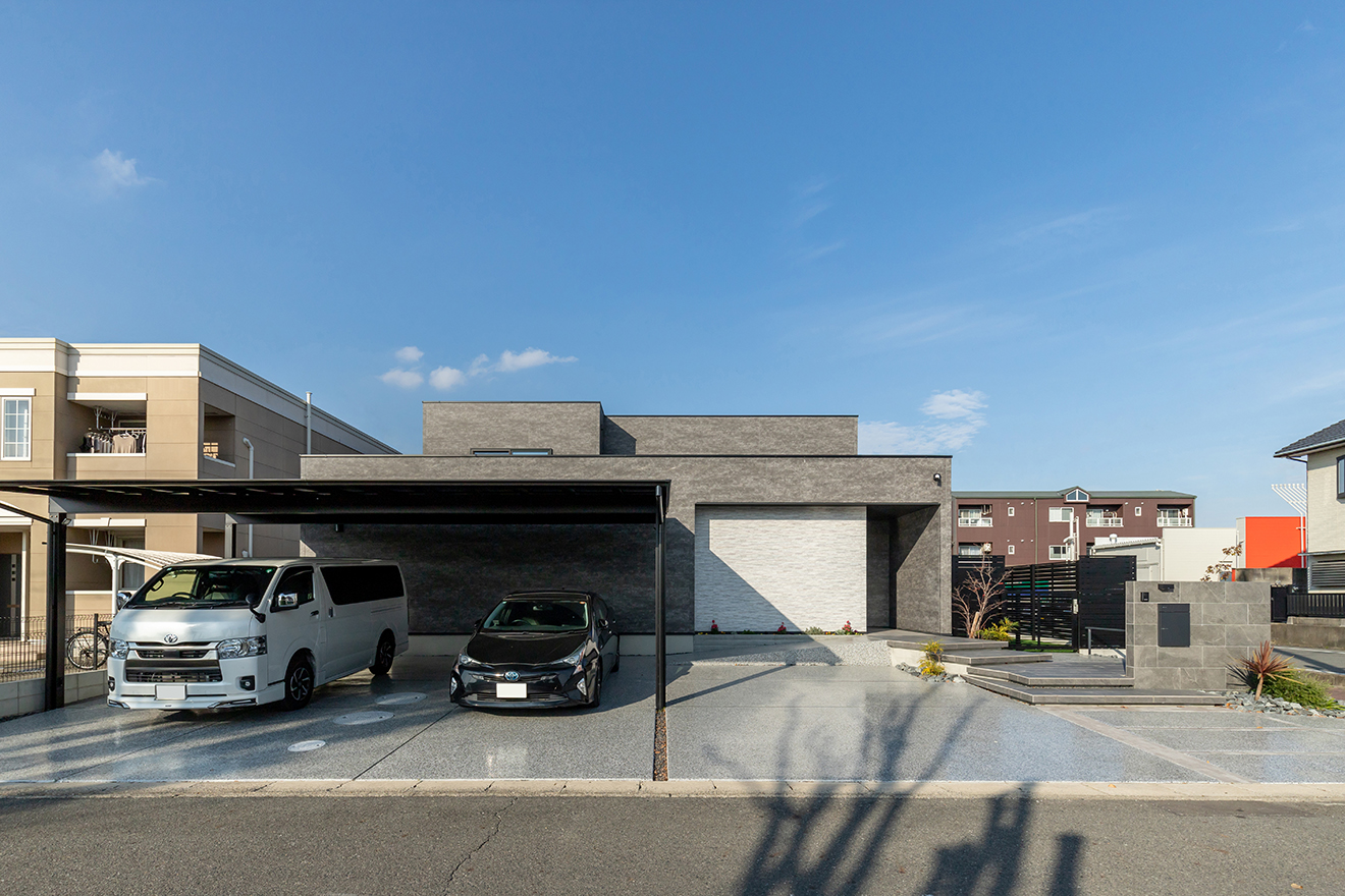 【外観】ベースにフラットサイディングを採用した、シンプルでスタイリッシュな外観。重なり合うボックスを組み合わせたようなシルエットが特徴的で、通りに面した窓を無くすことで生活感を表に出さないようにしています。