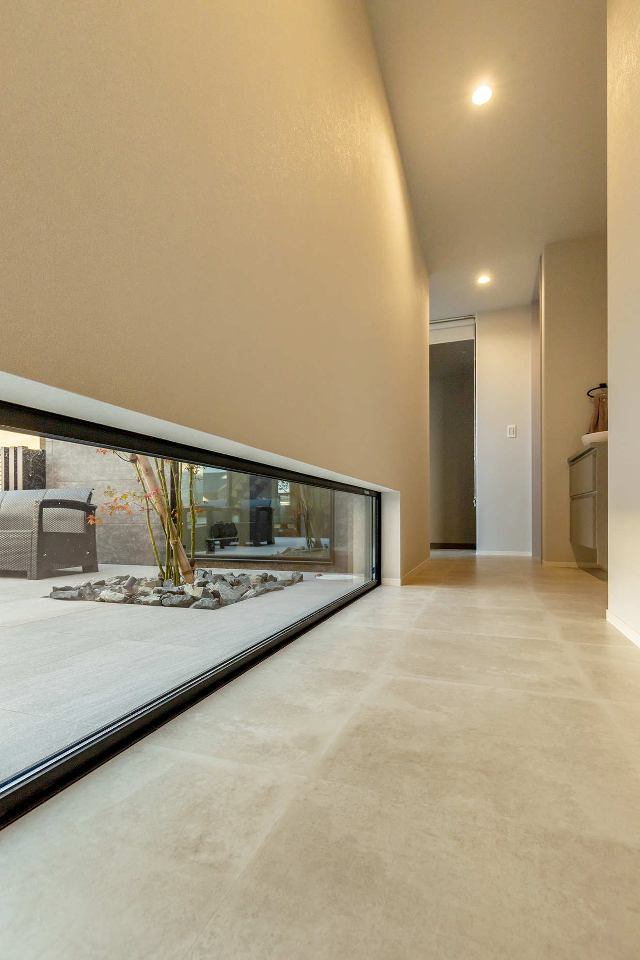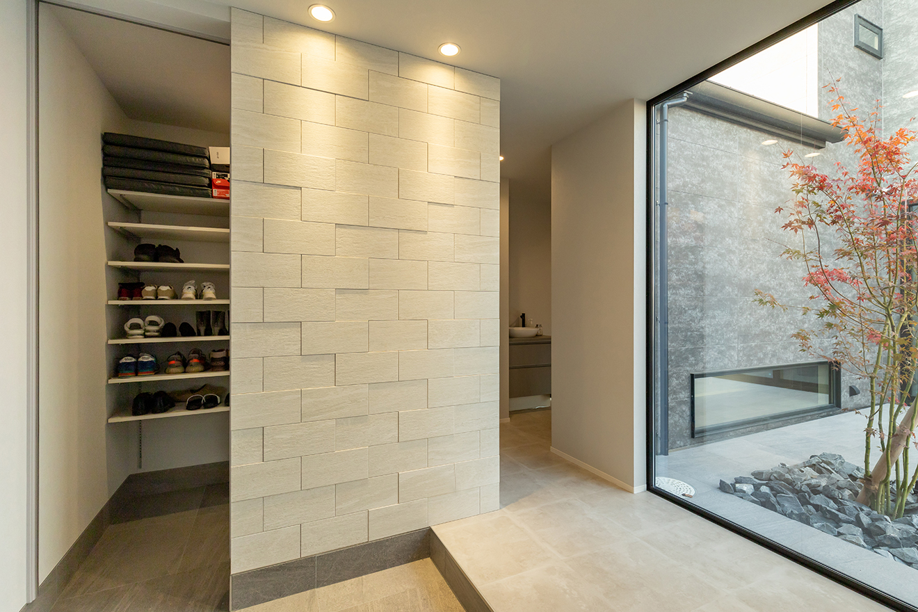 【玄関】ゆとりある深い軒を設けました。雨の日でも濡れにくく、自転車など大きい荷物も置くことが可能です。【玄関ホール】扉を開けると現れる大きなピクチャーウィンドウ。中庭の植栽を、まるで一枚の絵画のように切り取ります。