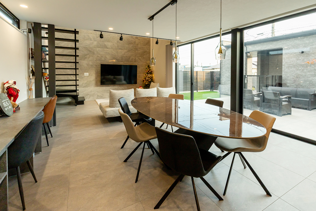 【LDK】吹き抜け、オープン階段、大開口の窓。28帖の大空間に開放的な要素を詰め込んだLDKは、どこにいても家族の気配と心地よさを感じられます。落ち着いたトーンで統一されたカラーリングで、洗練されたスタイリッシュな空間に仕上げました。