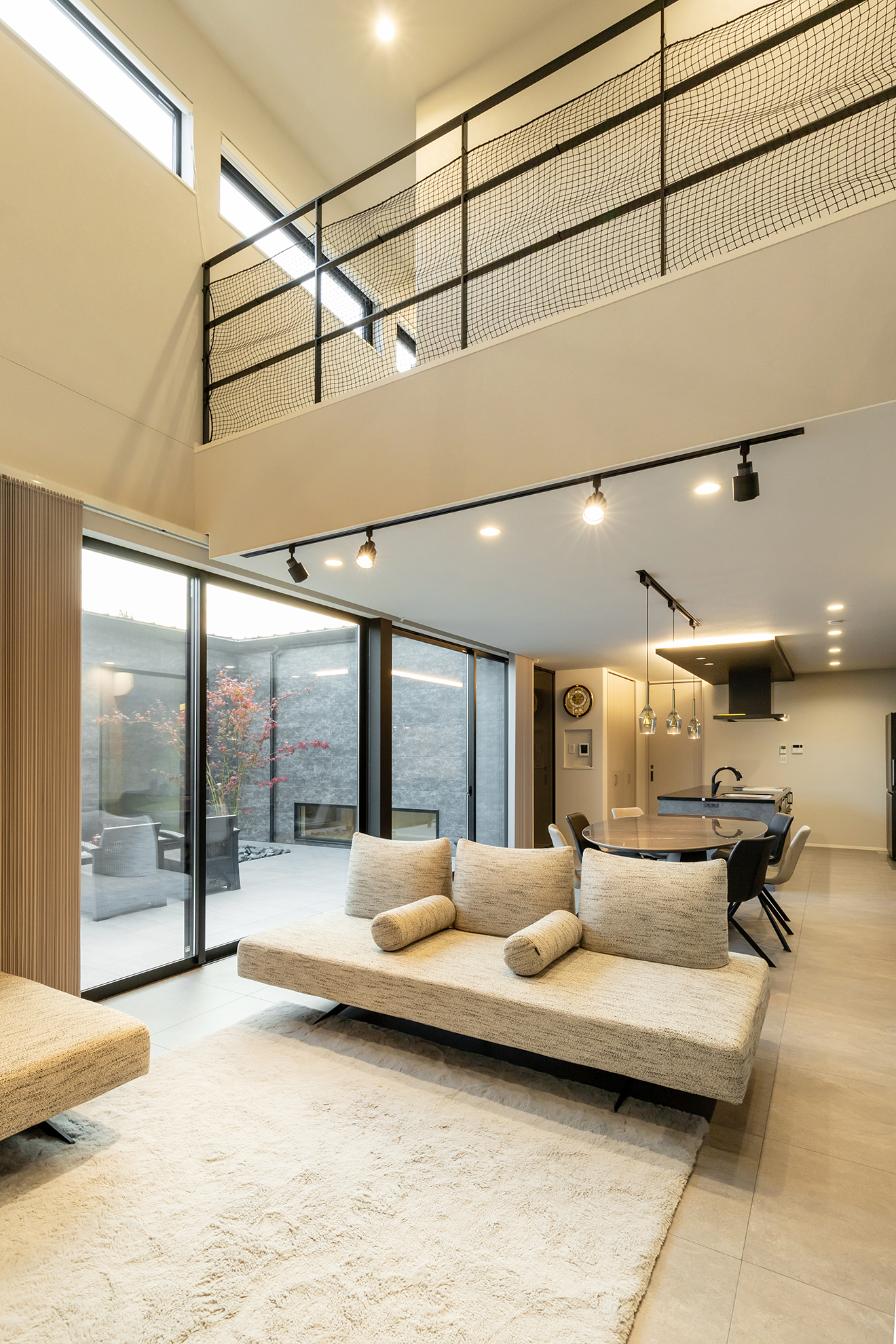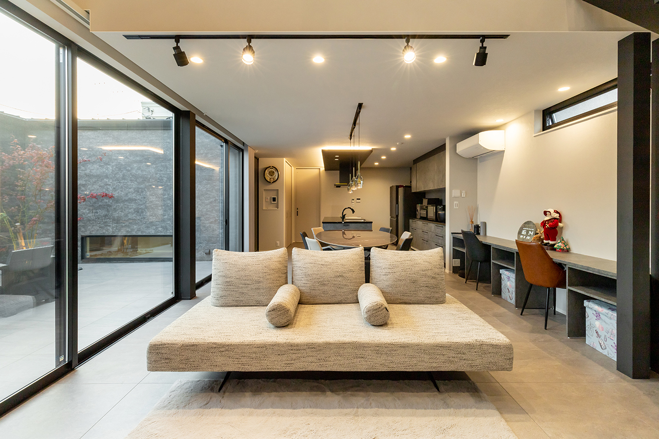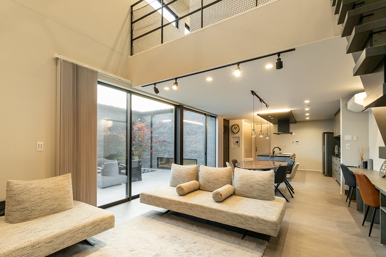 【LDK】中庭に面した南面には大開口の窓を採用。外部からの視線が届かないため、プライバシーを守りながら開放感を楽しめます。