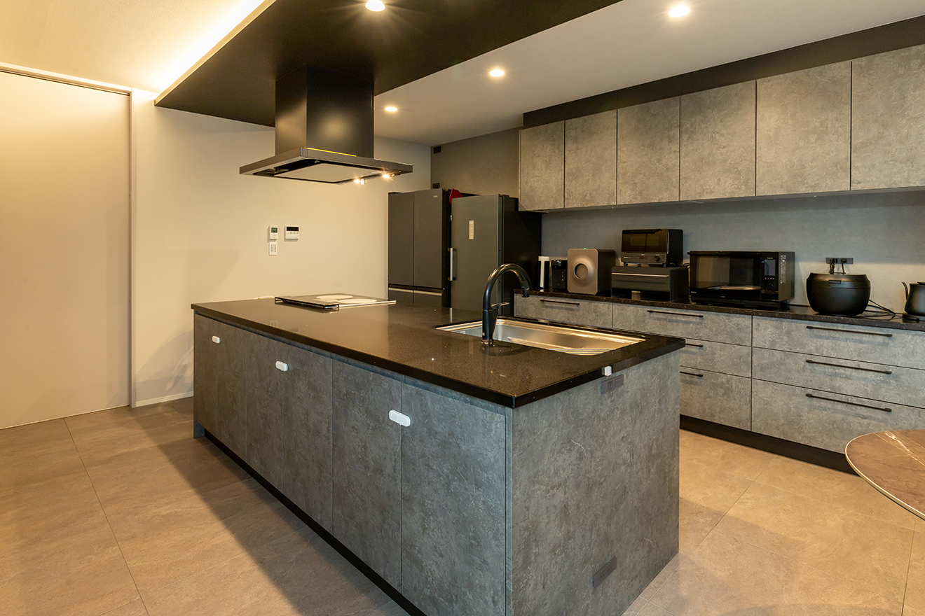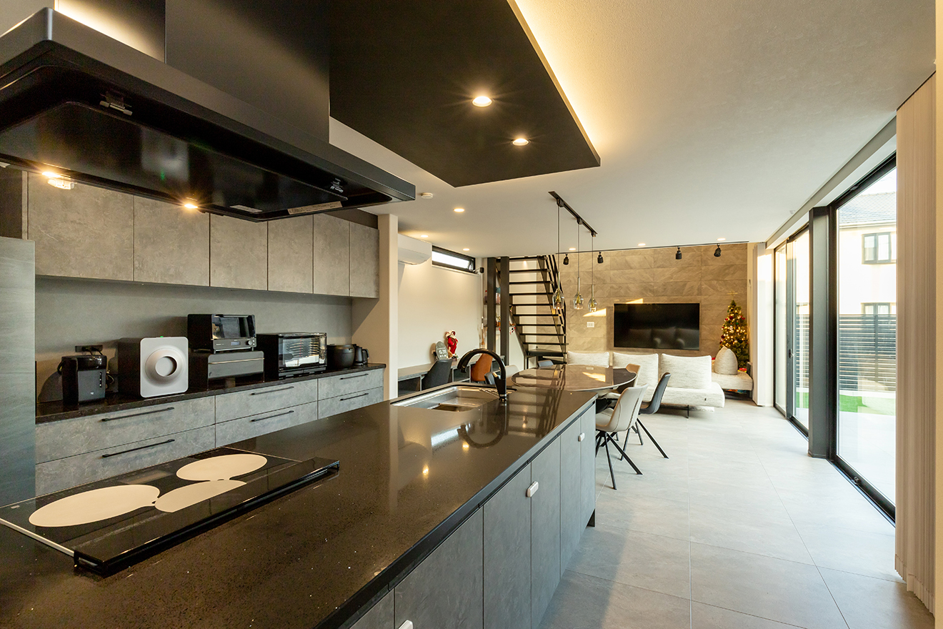 【キッチン】家電や設備をブラックで統一。ホテルライクで上質な空間です。フルフラットのフィオレストーン天板は天然水晶ならではの質感が、空間に上質な品格をもたらします。