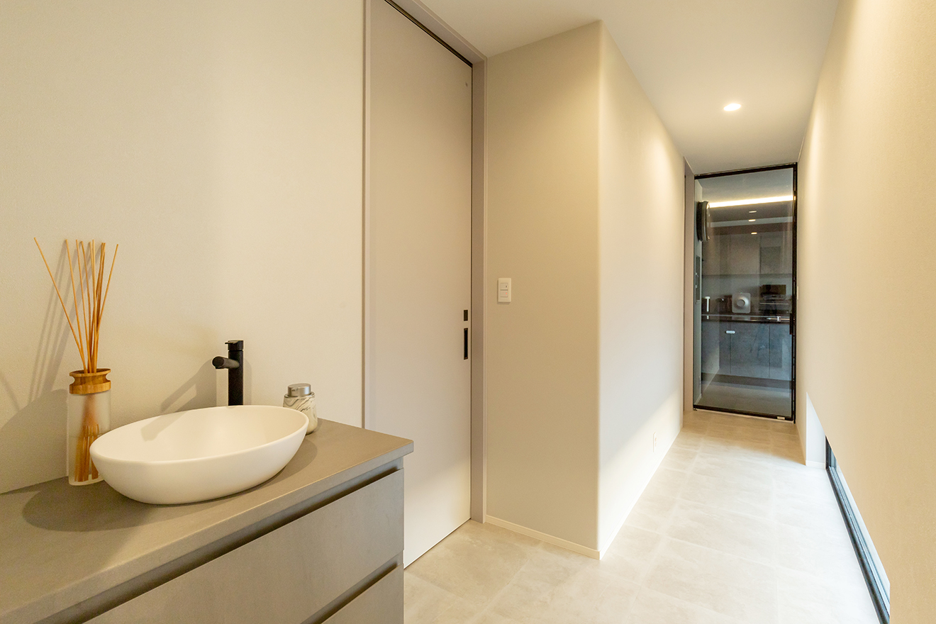 【廊下】玄関先にはデザイン性の高い手洗いスペースを設置。帰宅後すぐに手を洗える利便性も魅力です。ホールに配した地窓から、廊下へと柔らかな光がこぼれます。直射日光を抑えた落ち着きのある光が、静かな高級感を演出。