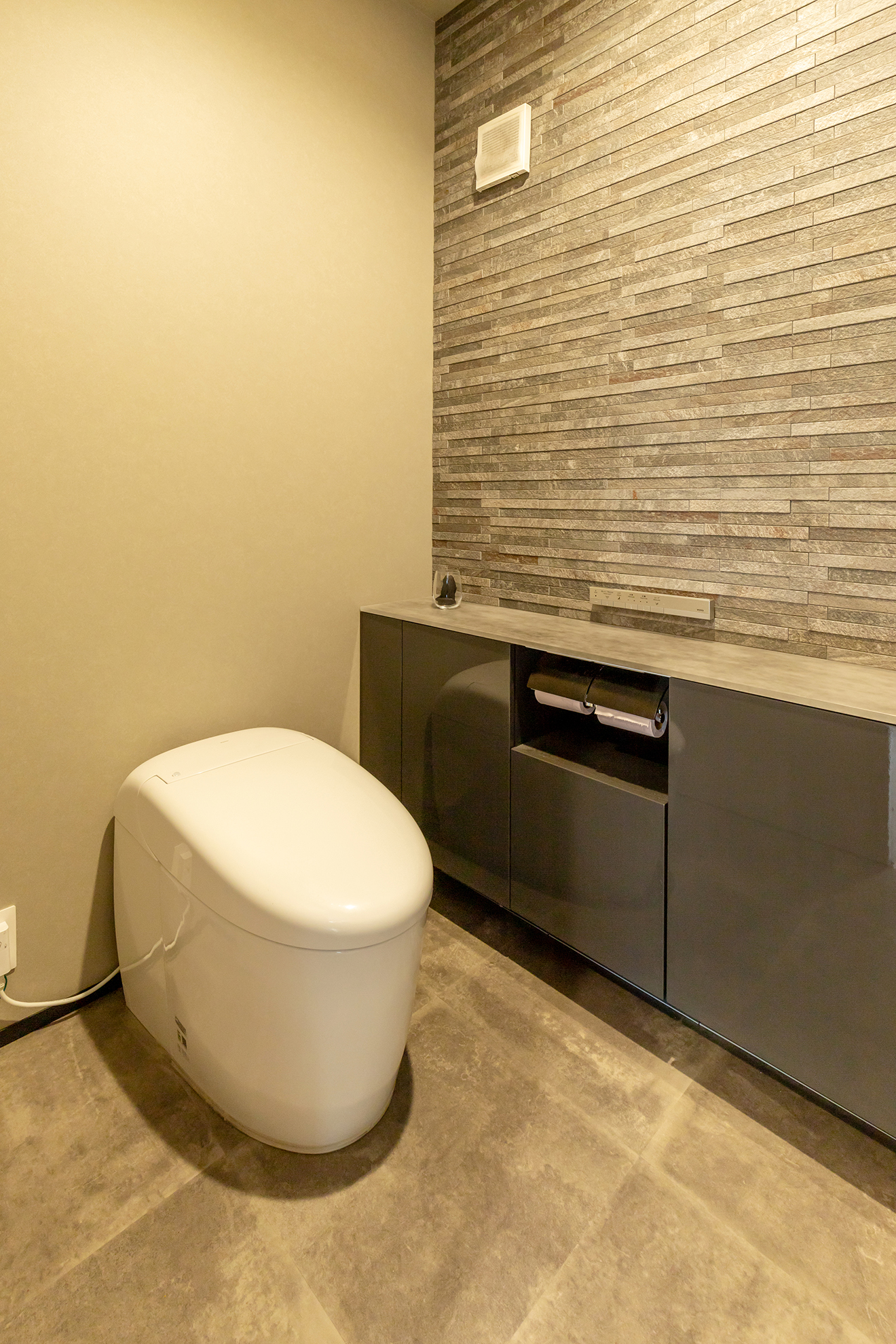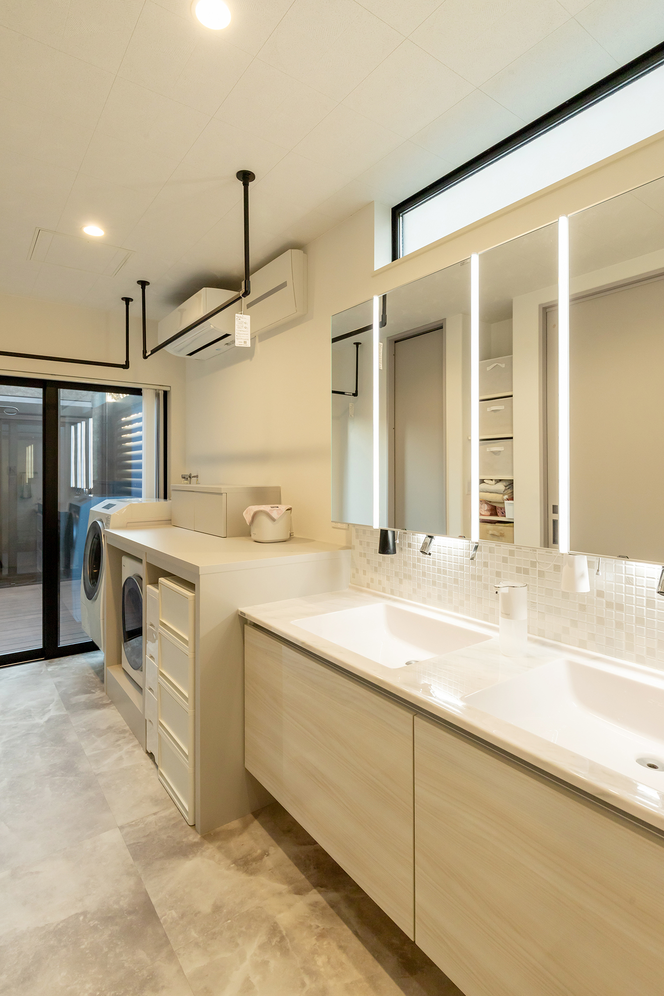 【ランドリールーム】外部の物干しスペースへ直接出入りできる便利な家事動線を実現。洗う・干すの動作が最短距離で完結します。【トイレ】壁面にはタイルを採用。上質な素材感が漂う高級感に加え十分な広さと収納を確保しました。